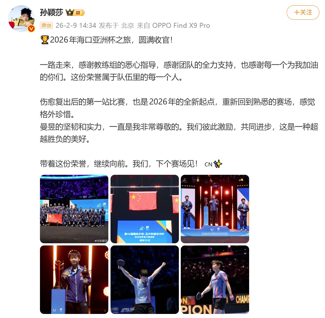 2月9日,孙颖莎通过个人微博总结亚洲杯之旅,全文如下: