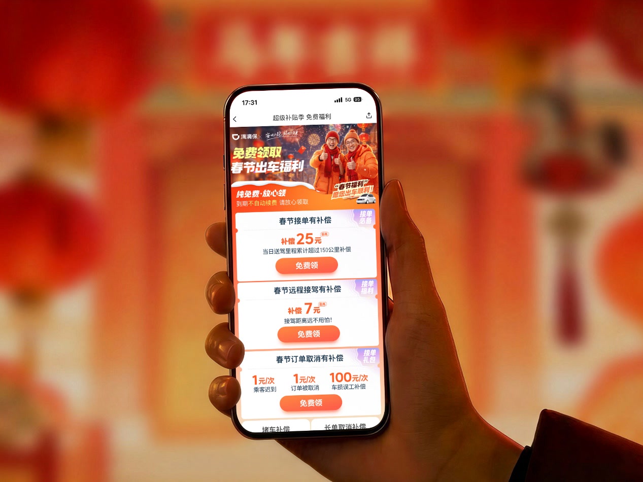 春节期间,司机师傅可在滴滴车主生活页的滴滴保内,免费领取7项春节出车福利,覆盖接单、远程接驾、订单取消、堵车、长单取消等出车场景。