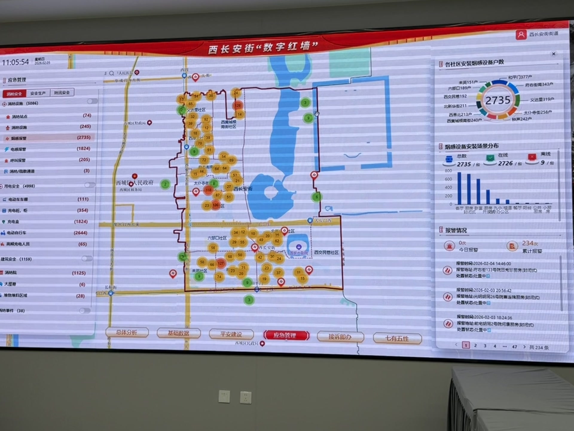 记者在街道指挥大厅的大屏幕上看到,“数字红墙”系统实时显示着所有新设备的运行状态、所在位置和房间、报警情况等信息,实现全流程可视化管理。