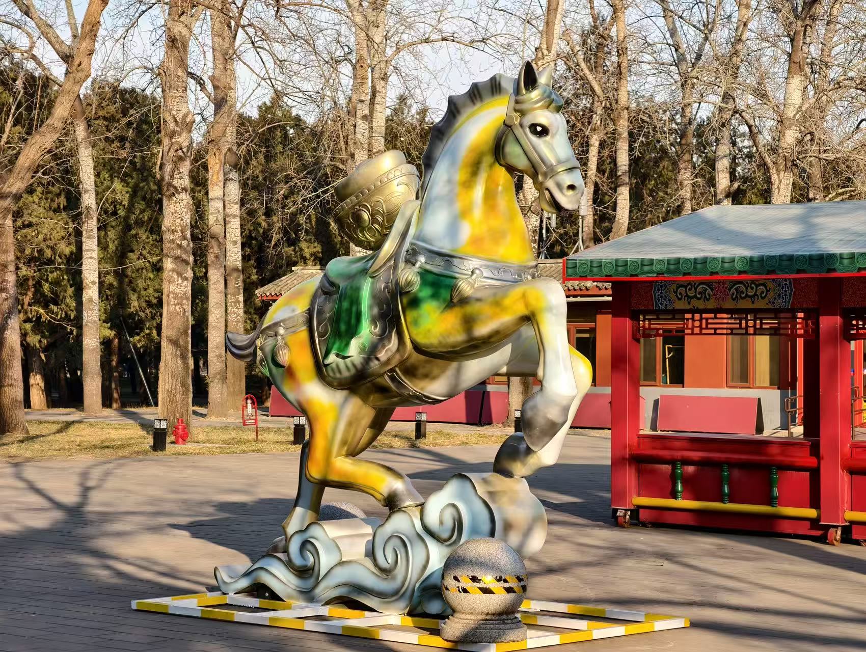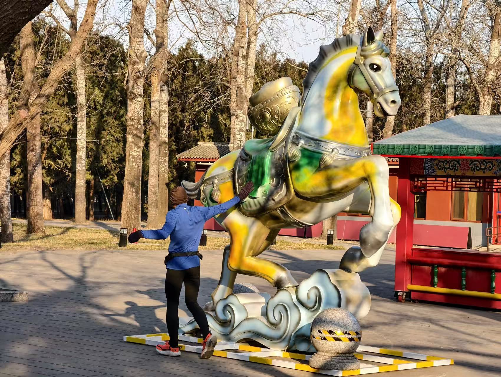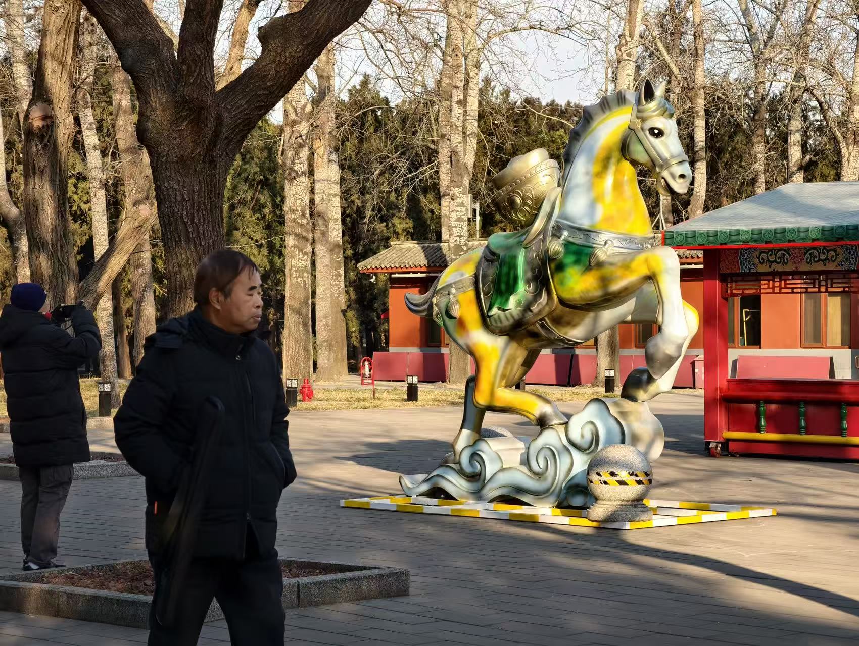 尽管离春节还有几天,公园已经处处洋溢新春气息。公园专属IP吉祥物“瑞马”成为当之无愧的“主角”,其头顶微缩祈年殿头饰,朱红马身、青蓝鬃尾复刻祈年殿红墙蓝瓦的配色,颈间金钟、背上搏拊鼓呼应神乐署“声传祥瑞”的文化内核,红底金字福袋更承载着“福气满袋、万事顺遂”的新春祝福,既是马年生肖符号,更是天坛文化的传播载体。