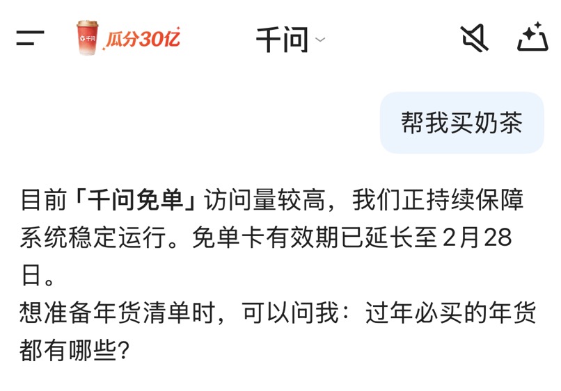 2月6日,阿里旗下的AI助手应用千问推出“春节30亿大免单”活动,消费者只需要打开千问App,在对话框输入“帮我买奶茶”,就能花1分钱喝到25元的奶茶。一时间,大量用户涌入千问App,当天下午,天通苑附近一家霸王茶姬的线上订单已经排了60多单。“平时工作日也就是个位数,最多十几单,今天一早醒来订单就爆了,基本全来自淘宝闪购。”店员说。