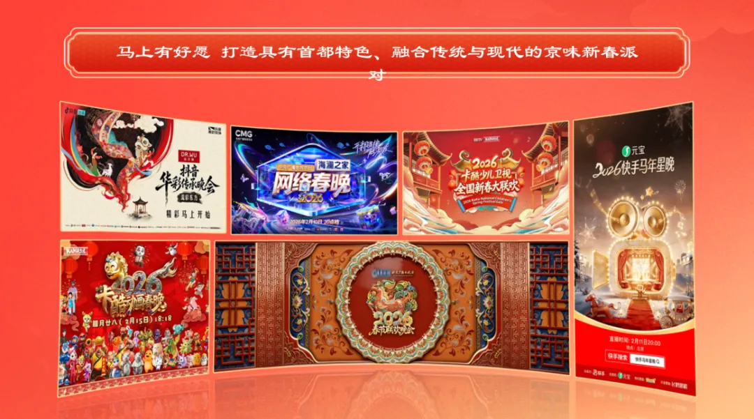 着力打造一系列具有首都特色、融合传统与现代的新春派对。北京广播电视台将推出《2026年春节联欢晚会》《卡酷动画春晚》等,持续打造有温情、烟火气的晚会盛典;抖音《华彩传承晚会》、快手“马年星晚”等网络春晚,也将以年轻化、互动化的形式陪伴大家守岁迎新。