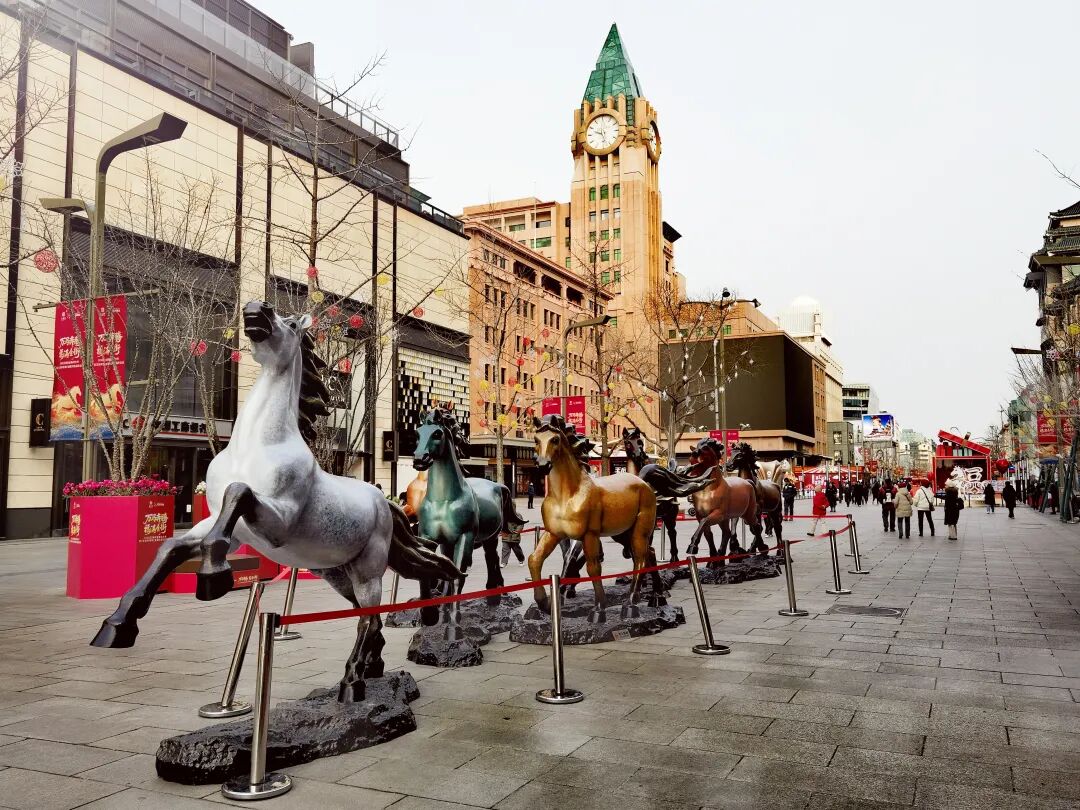 2026年是农历丙午马年,活动特邀中国工艺美术大师朱炳仁匠心创作,在街区内打造“王府八骏”艺术雕塑群,八匹骏马姿态各异,或昂首奔腾尽显昂扬锐气,或从容驻足流露沉稳气度,铜色流光与夜间灯光交相辉映,在金街街头形成一幅立体鲜活的“奔马图”,既与“万马奔腾”活动主题深度呼应,更寄托着奋进不息、前程万里的新年愿景,为金街增添了浓厚的文化底蕴。