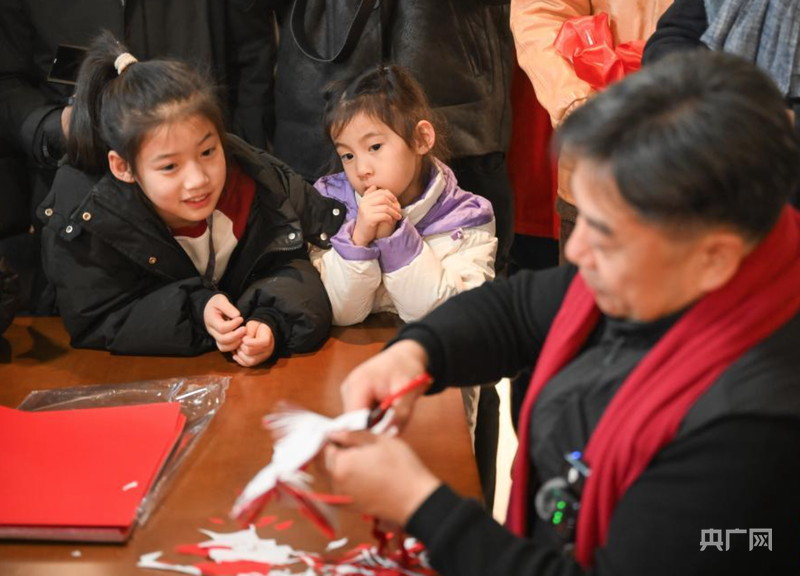 两名儿童在观看剪纸创作(央广网发 马金瑞 摄)