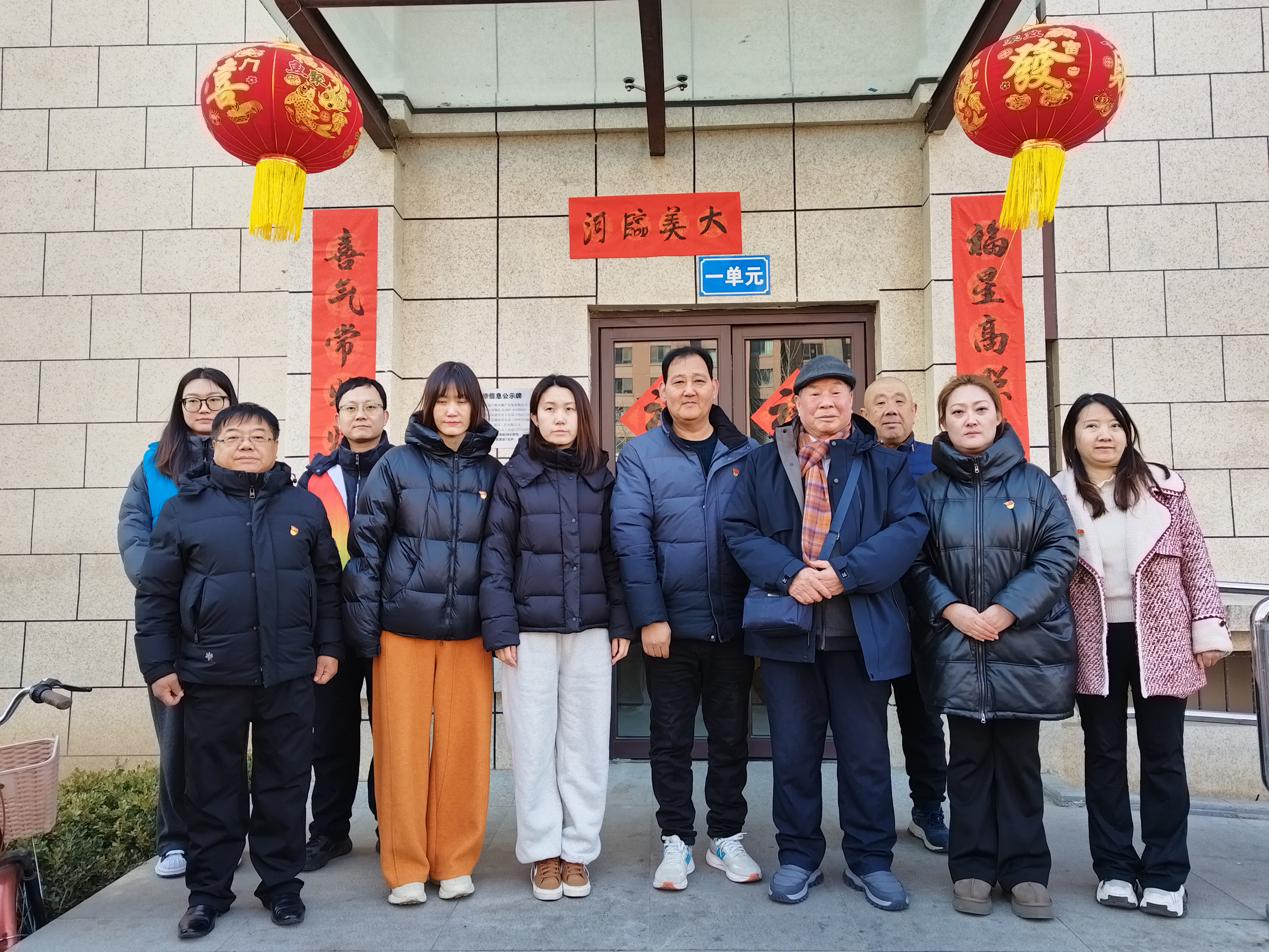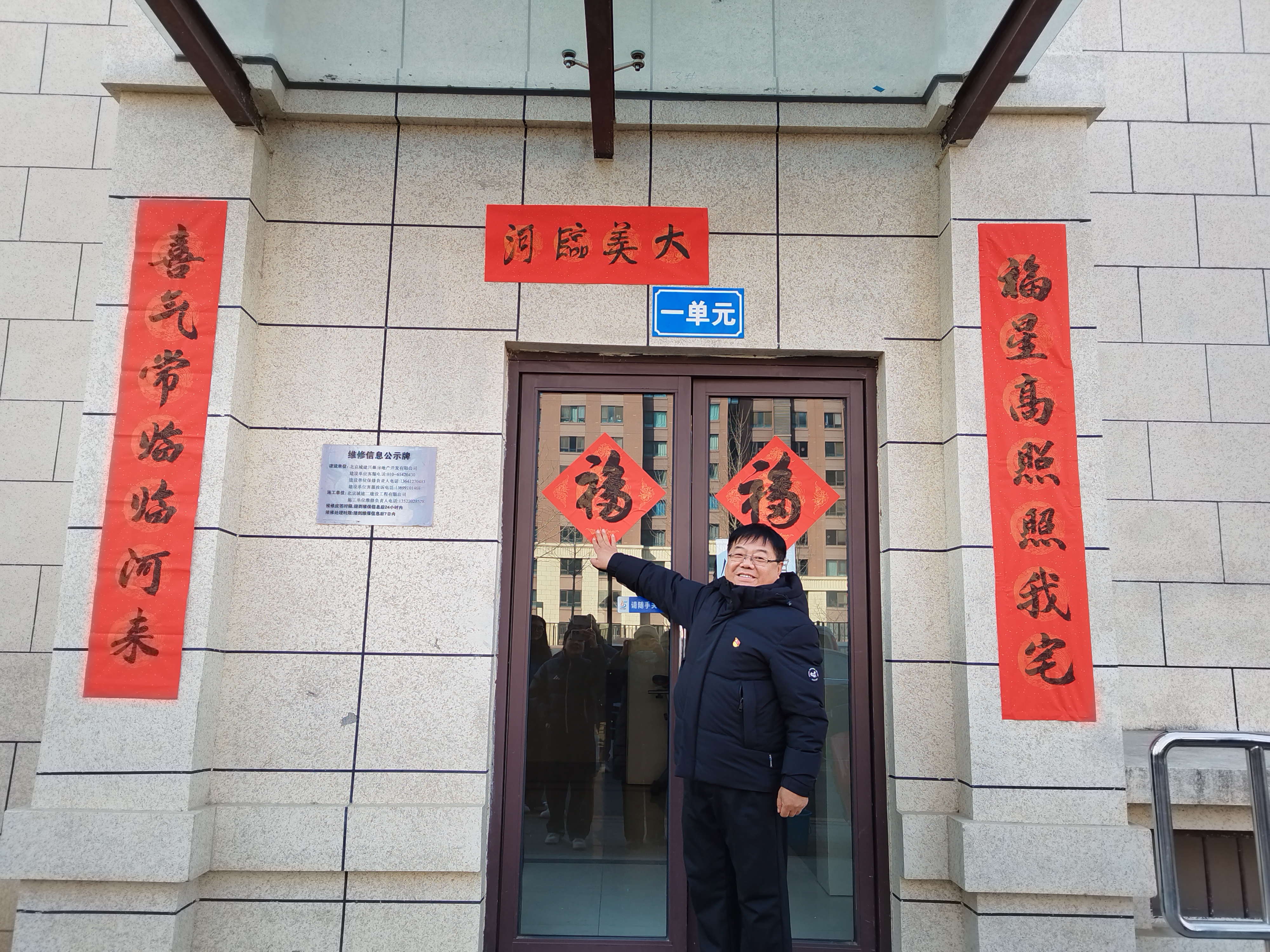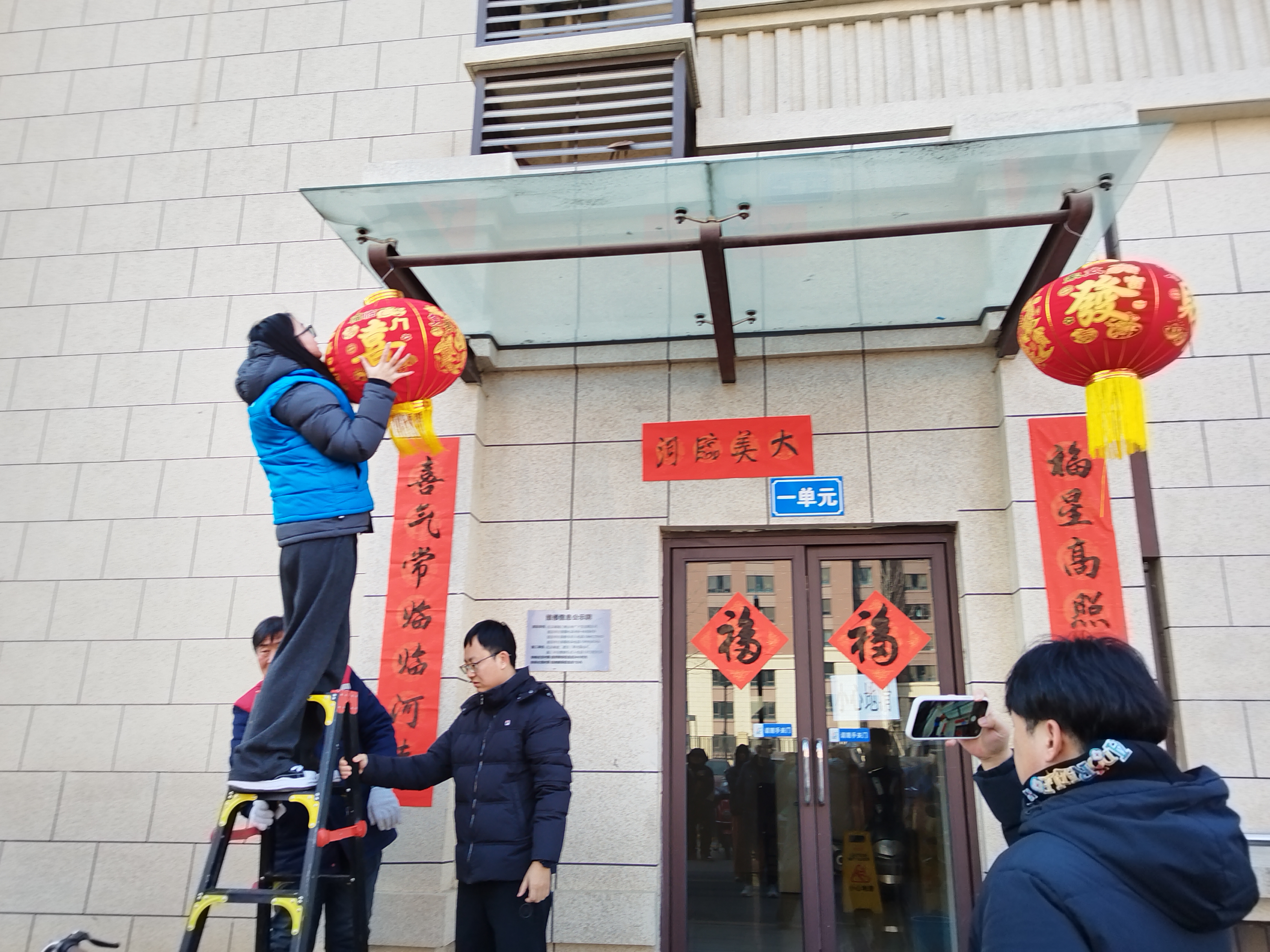 今天,是腊月廿三,小年。早上八点,村干部和村里的老党员,居委会干部和仁和润丰物业的工作人员,就将这些春联逐楼贴到村民单元门的门口,还挂起了大红灯笼,透着节日的喜庆气氛。同时,把福气一点点送到每位村民心里。