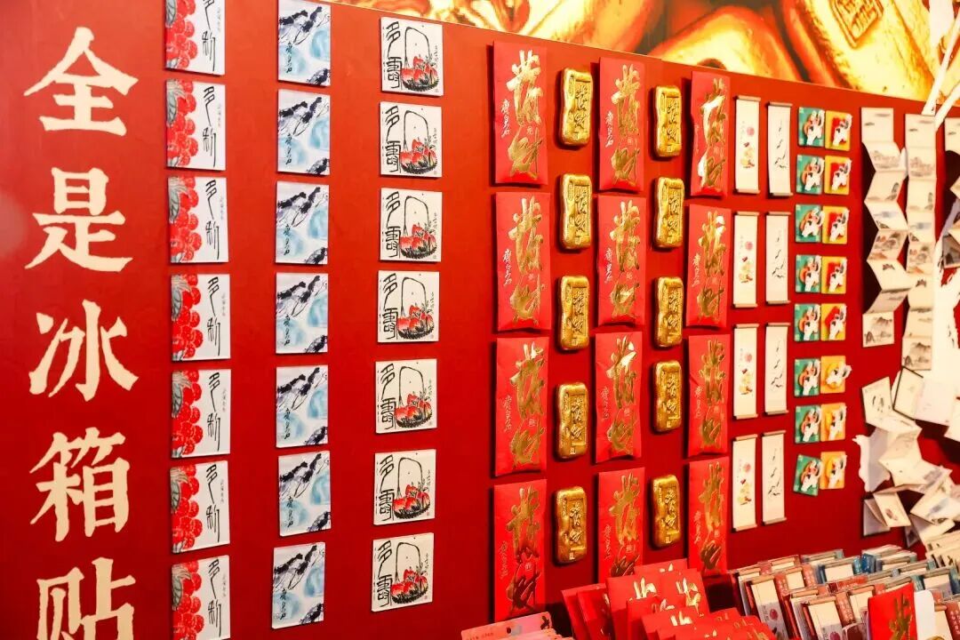 发财金条冰箱贴、手工印染大对联、福字套装、“钟馗纳福”对联冰箱贴、齐白石可爱杯盲盒等产品应有尽有,带上几件回家,为年味添点艺术气息。