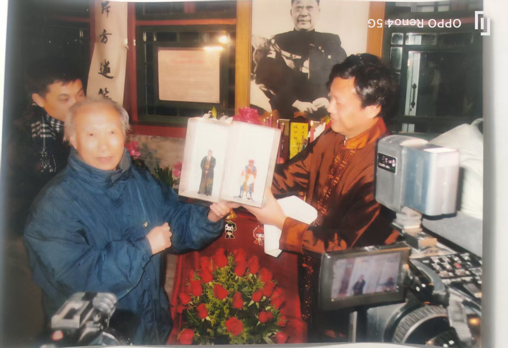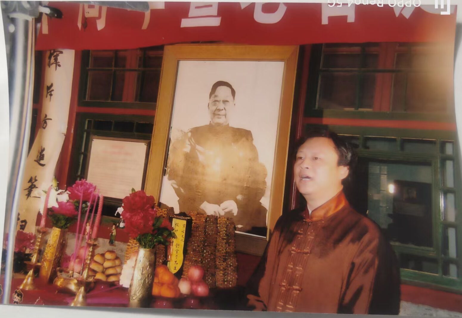 这天下午,有的人刚过两点就来到老舍故居,开始了准备工作。这场祭奠得到了老舍纪念馆的大力支持。他们打开展室的玻璃门,特别批准,把老舍先生的巨幅照片请了出来,供奉在庭院中。像前的供桌上,按照民间的习俗摆放着五供:一对花筒、一对蜡烛和一对香炉,后面是五碟糕点和五盘水果。为了强调它们是供品,上面还插上了供花、福禄寿三仙和和合二仙。供桌的最后一排,是五座宝塔形的蜜供,这是老北京祭灶之日必备的民俗用品,现已绝于市。没办法,只好由民俗专家亲自制作。蜜供中间摆放着一座木质牌位,上书“北京民间文化祖师舒舍予先生之灵位”。祭奠仪式在民间文场的“打三参”响器声中开始。民间文场是老北京庙会上祭祀必备的演出,表演者是“西直门外五虎打路”的老少爷们。他们为了祭奠老舍先生不辞辛苦,不计报酬,有的怕道儿不熟,还提前来“踩气,以免误事”。接着,由主祭人老舍纪念馆张文生馆长和老舍先生家属代表,民俗专家、民间工艺大师等陪祭人燃烛、上香。伴随着古老的祭祀音乐,开始朗诵老舍先生自传体长篇小说《正红旗下》片段: