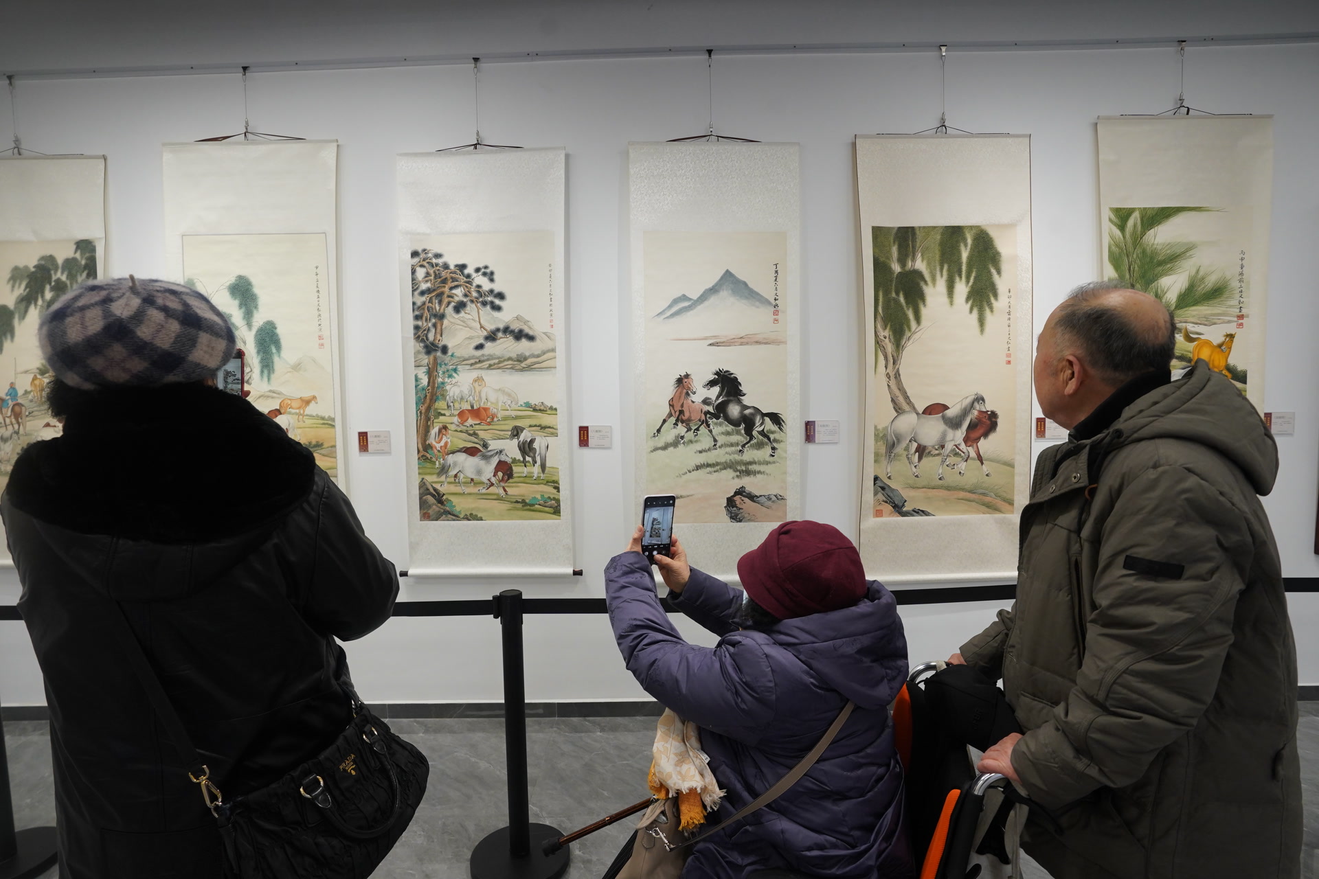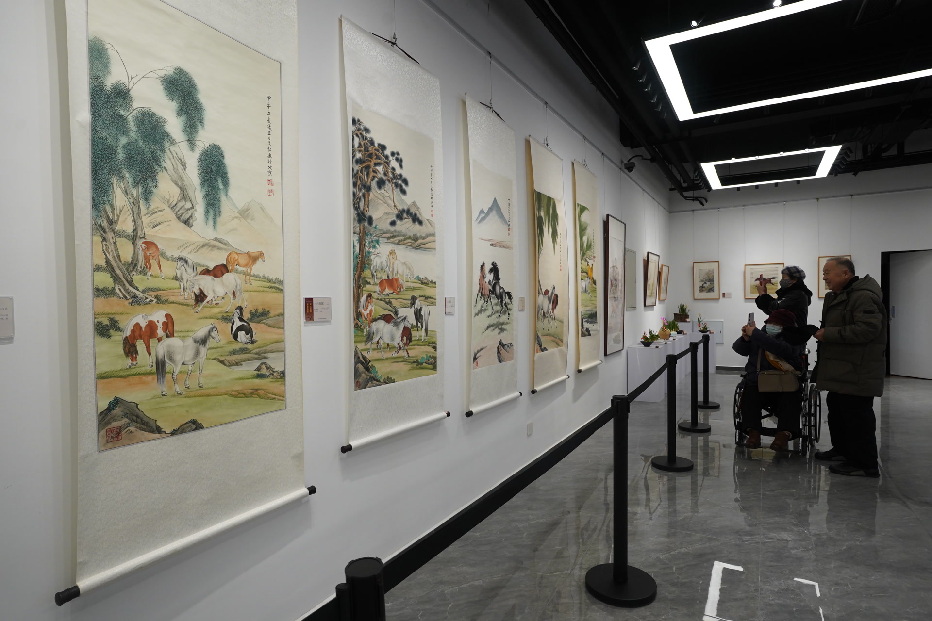 2月10日,洒然轩展厅里,墨香与花香交融,展览布局错落有致。《百骏图》《八骏图》等作品气势恢宏,骏马筋骨分明、动感十足,尽显“万马奔腾”的壮阔气象;《牡丹图》《白荷图》等花鸟作品工笔精微,花瓣纹理、翎羽层次清晰可辨,流露“百花齐放”的勃勃生机。记者看到,还有40余组传统花卉与水仙雕刻作品点缀其间,与国画相映成景,营造出高雅精致的审美空间。