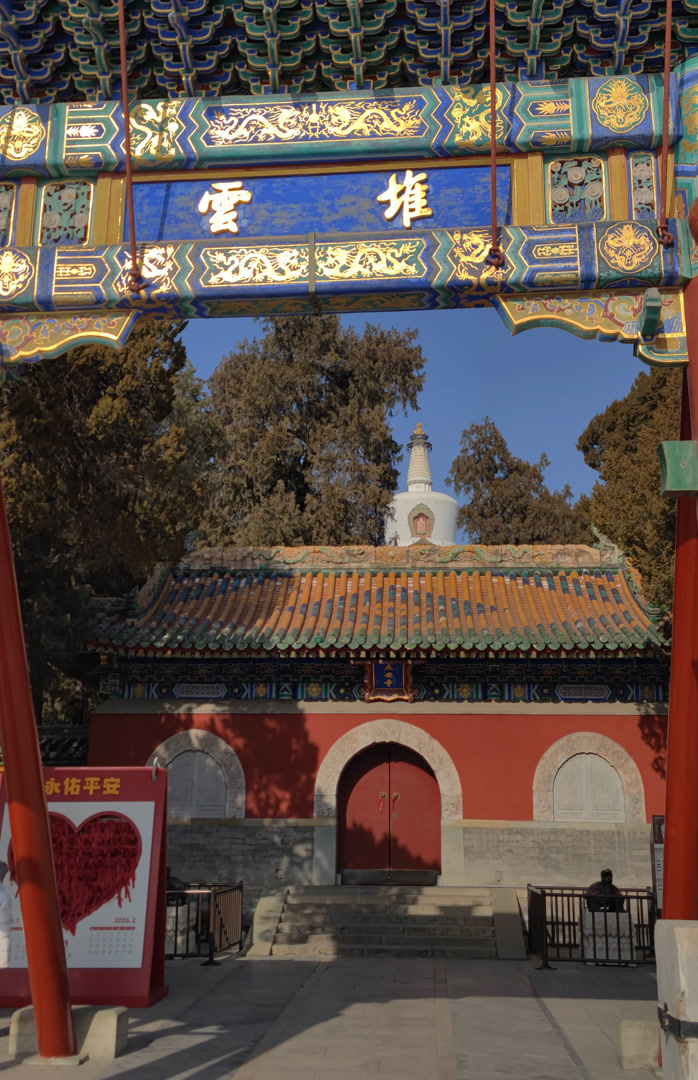 其实这俩狮子跟永安寺没一毛钱关系,因为它们的职业不是给永安寺看门,人家是守桥的。永安寺对面为一座三孔石桥,名叫永安桥,桥两端各建有一座牌坊,横额上分别写着堆云、积翠,所以也称堆云积翠桥。两个牌坊下各有一对石狮子,积翠的朝南、堆云的冲北。永安寺门口这俩狮子,是属于桥北堆云牌坊的。既然是守桥的狮子,那自然是后背冲着桥,脸就对着寺庙了。可这堆云的石狮子离寺门太近了,看上去确实很像寺庙的狮子放反了。其实原本寺门不在这儿,是因为乾隆年间永安寺扩建,直接把寺门砌到了牌坊跟前儿。要不是有牌坊和石狮子拦着,估计乾隆爷能把寺门修到桥头儿去。