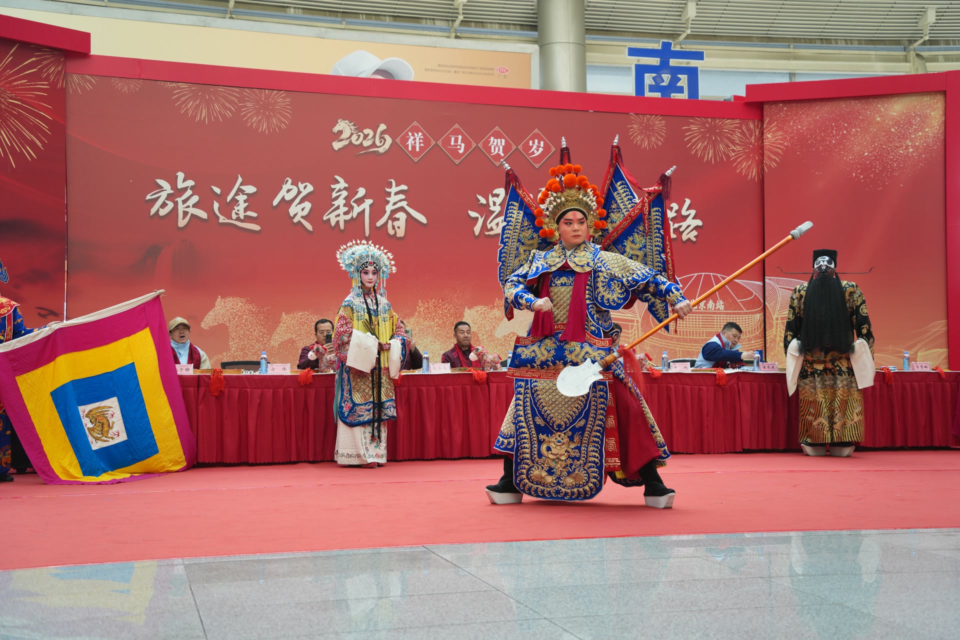 春节打卡点、特色窗花、红色灯笼、客运形象玩偶……春运期间,走进北京南站,到处洋溢着喜庆的氛围。上午9点半,欢快的音乐响起来,快闪舞蹈《大家一起来》吸引不少出行旅客的脚步。还未从快闪舞蹈中回味过来,锣鼓声倏然响起,精彩戏曲继续上演。《挑滑车》的铿锵豪迈、《包龙图》的凛然正气、《贵妃醉酒》的典雅雍容,三个经典京剧选段接连呈现。9位专业演员登上舞台,唱念做打间尽显国粹风华,旅客举起手机记录旅途中的意外惊喜,掌声与喝彩此起彼伏。