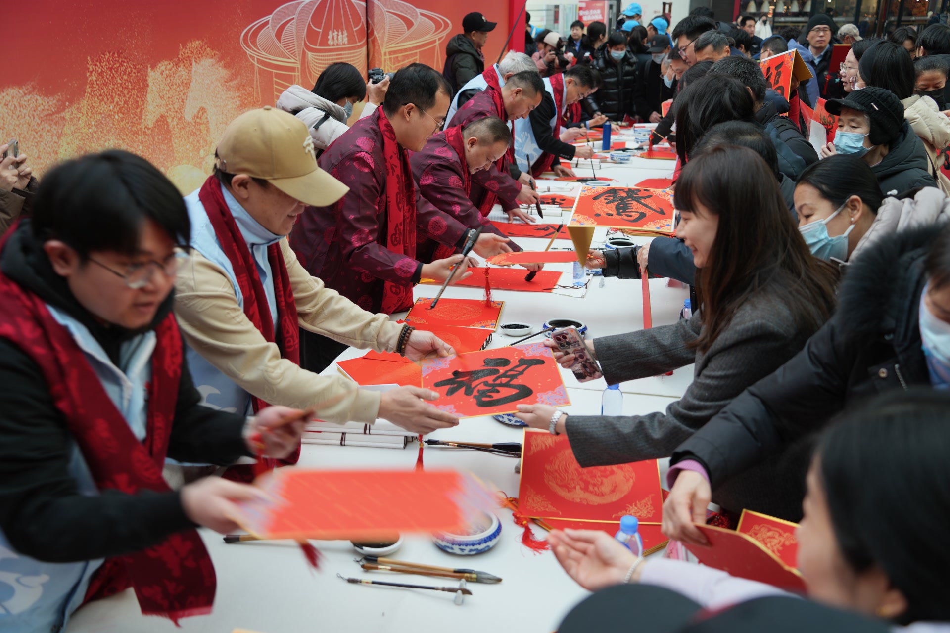 戏韵未散,墨香已起。长桌前,毛毡铺展、墨香四溢,中国书法家协会、北京书法家协会和中国铁路书法家协会等书法家们正挥毫书写“福”字与春联,一幅幅饱满祝福的福字送到旅客手中,拿到“定制款”马年福的旅客们纷纷打卡拍照。车站工作人员和志愿者还为旅客送上福袋、创意窗花和车站爱心品牌文创玩偶,邀请旅客讲讲自己的旅途故事,记录春运旅途时刻,送上最好的新春祝福。