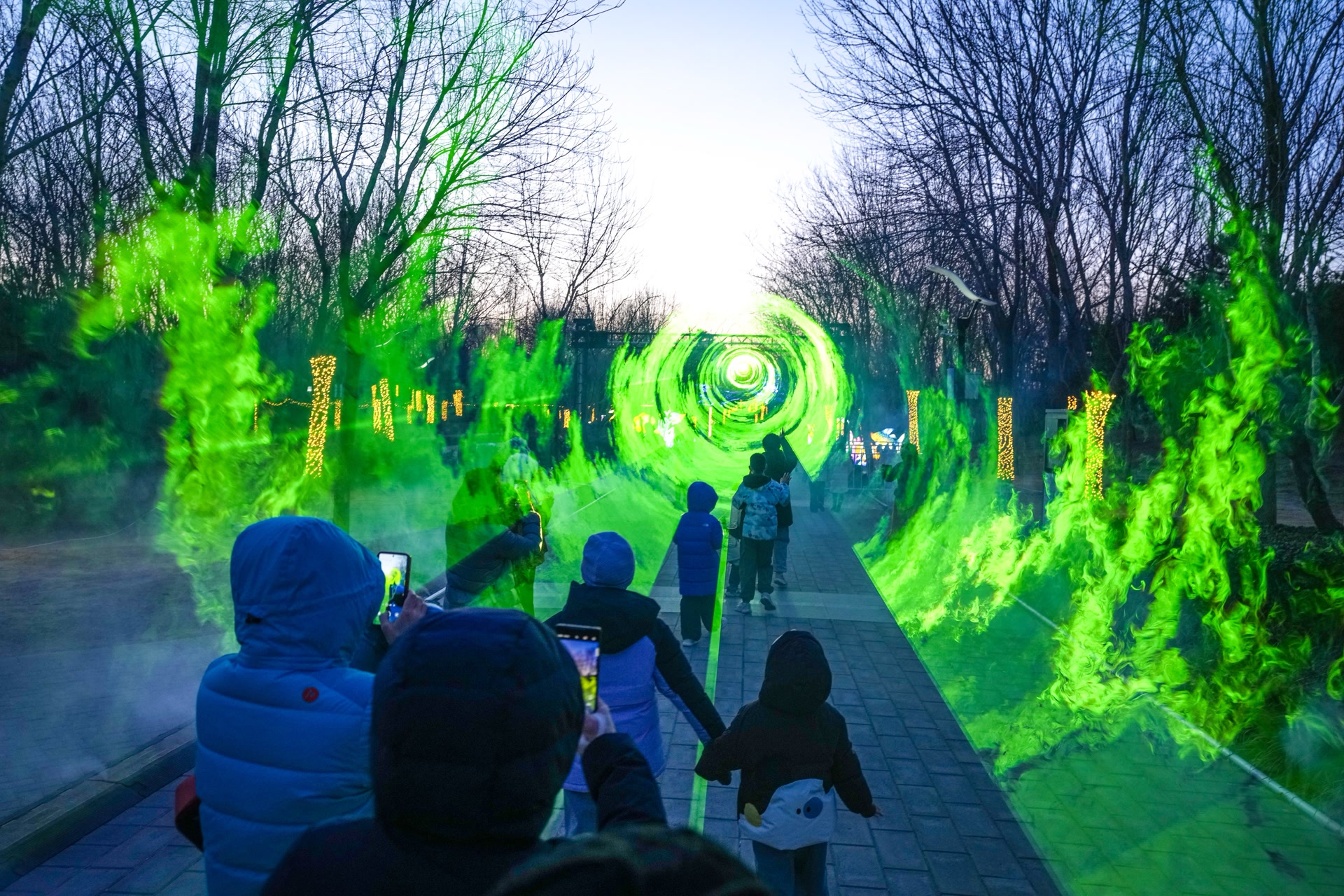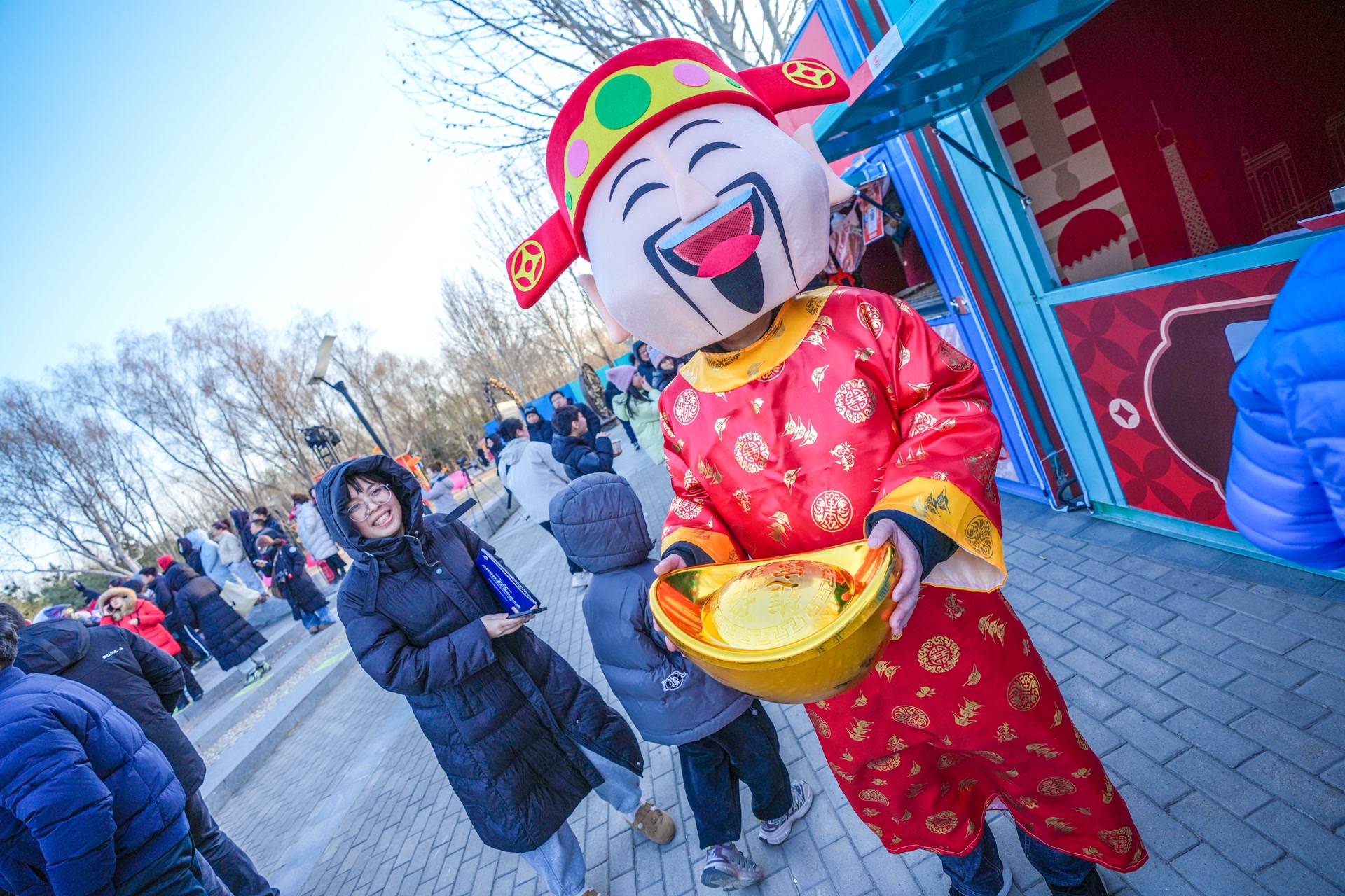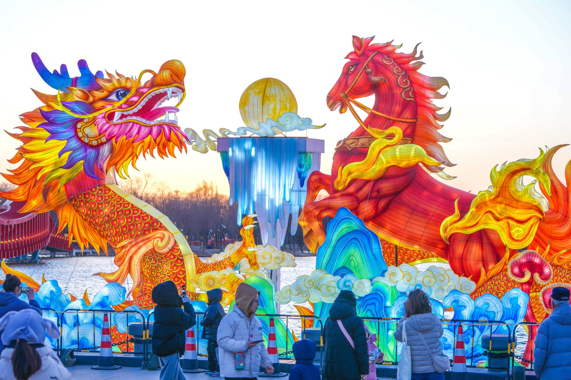 傍晚时分,台湖公园东门迎来大批市民游客,踏入公园,新国潮风格的新春乐曲传入耳畔,多数观众都是全家出游,人们有说有笑地直奔湖边巨大的龙马花灯前。这时,小丑表演舞台前围了里三层外三层的游客,演员风趣幽默的互动表演掀起现场一个又一个高潮。