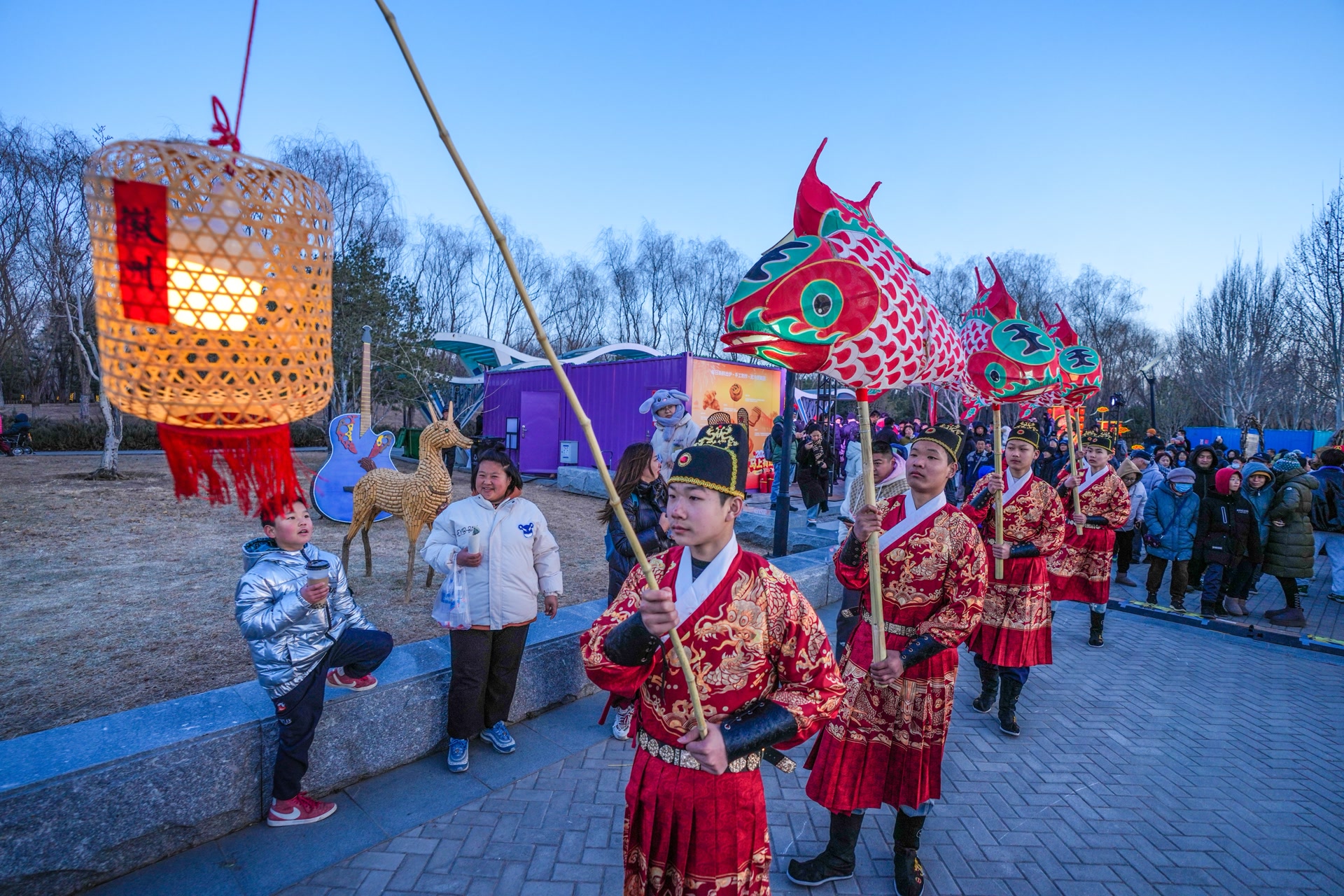 农历小年夜,台湖公园灯火璀璨、人声暖意交融,“2026马上有戏 台湖新春狂欢季”在此拉开帷幕。整座公园变身一座开放的“无界剧场”,国潮喜剧、非遗鱼灯巡游等表演融入公园各个角落,移步换景间,市民游客可以赏花灯品美食,还能观看特色表演。