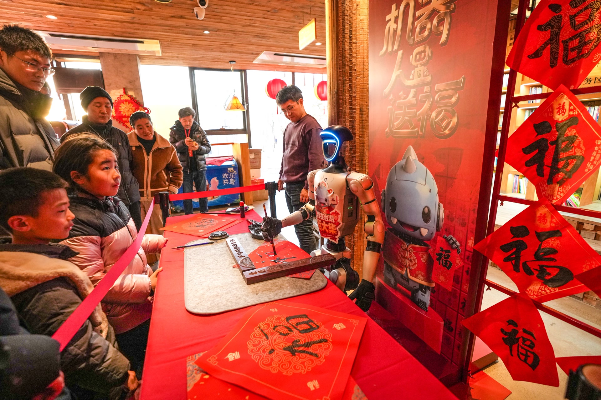 手持银票的游客们在互动游戏区域前排起了长队,“神马乐园”与“机器人送福”区域成为最受欢迎的打卡点,温顺可爱的矮脚马和俏皮的羊驼吸引众多家庭驻足观看。智能机器人化身“新春书童”,在红彤彤的春联纸上稳稳地写下一个个“福”字,游客排队领取这份融合科技与传统的“数字年礼”。