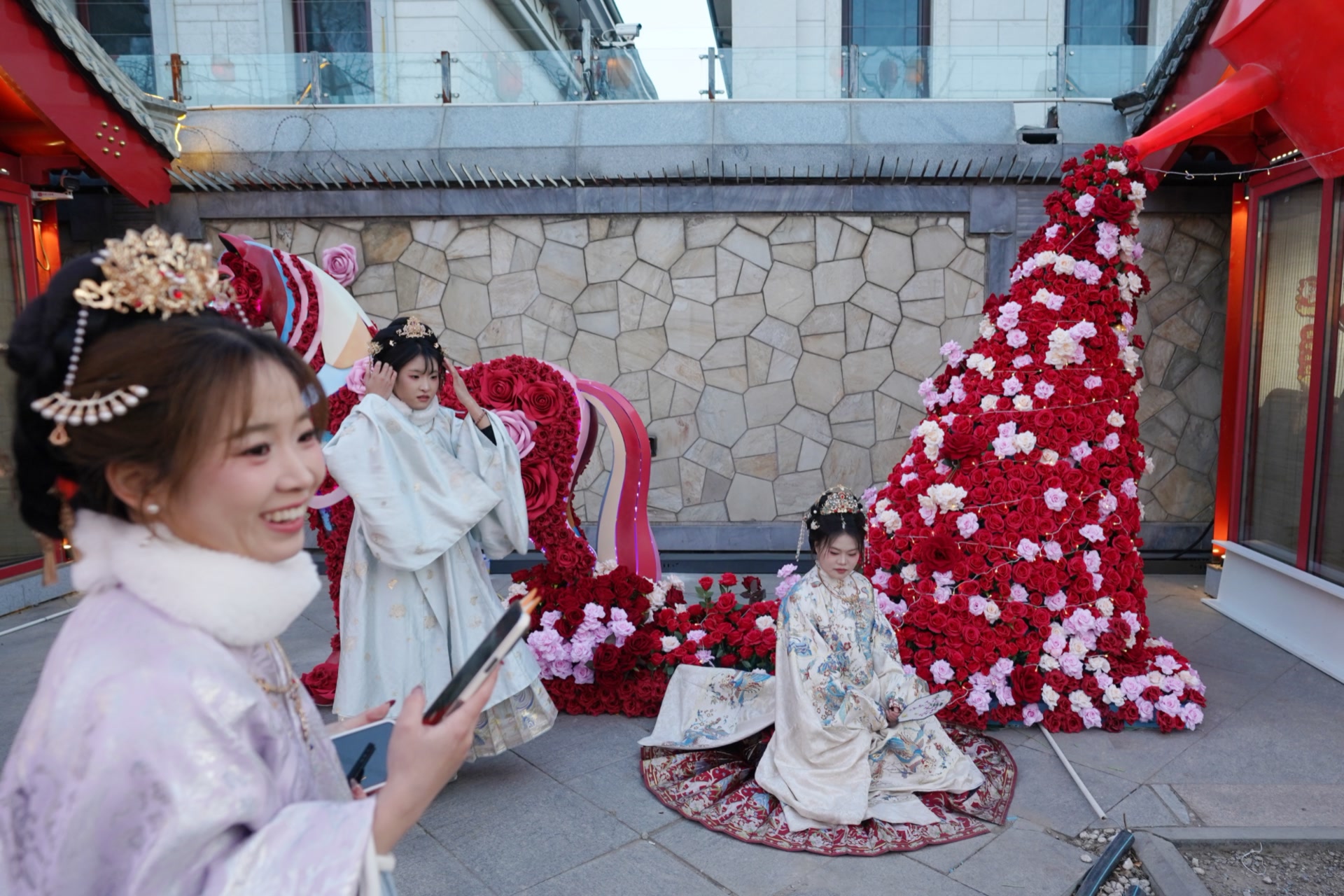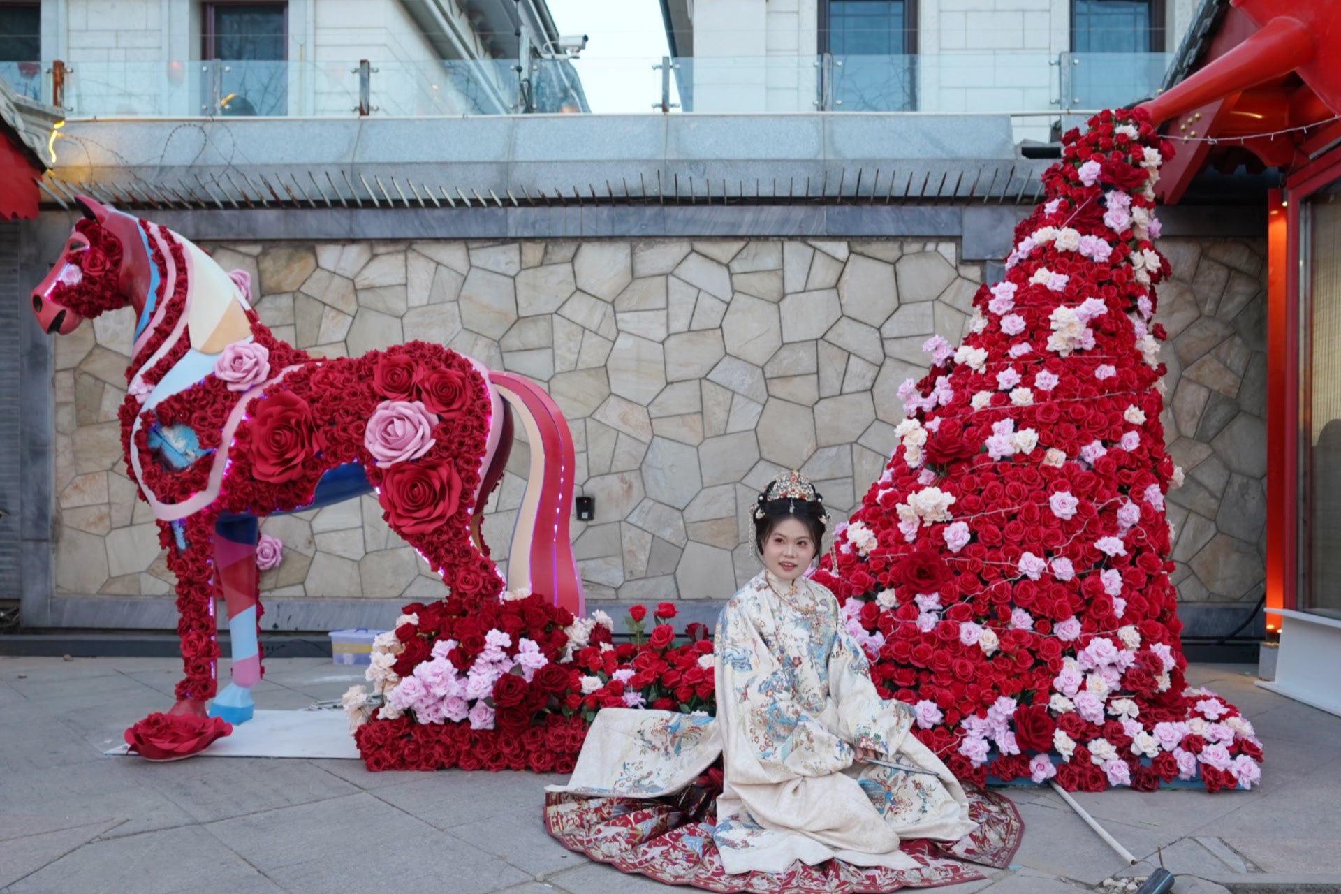行走在同庆街,已经是满街花灯,红黄交织,宛若灯海,点亮后更是璀璨若满天繁星,步道旁由9999朵玫瑰组成的花墙,悄然盛放,是新年最好的“氛围组”。