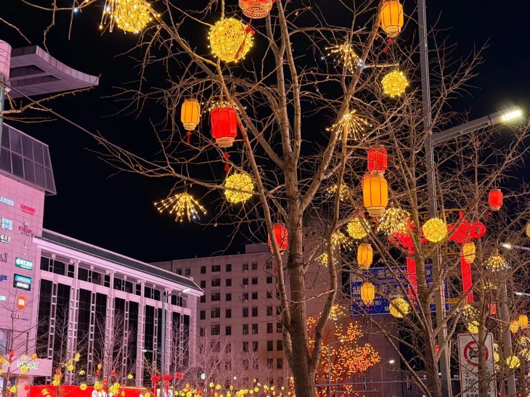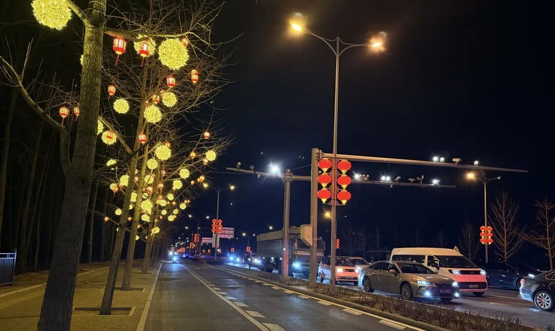 “新春快乐”灯环与路灯柔光相映