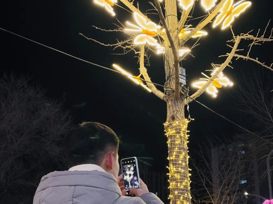 站前街暖黄色串灯缠绕树干