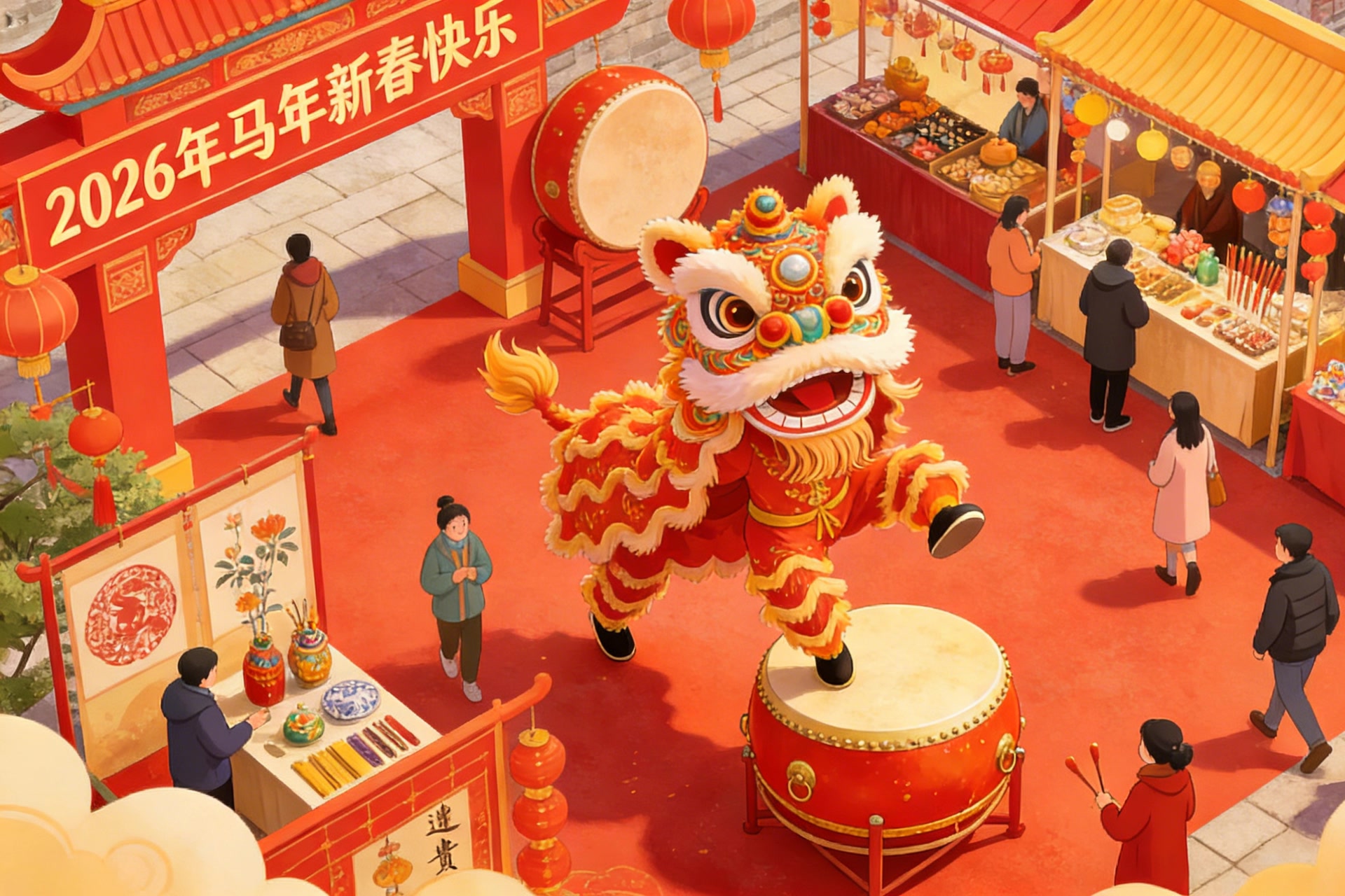 舞龙舞狮热闹开演,搭配特色非遗展示,锣鼓喧天庆马年,沉浸式感受传统新春氛围,解锁传统文化独特魅力。