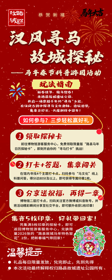 参与“汉风寻马 故城探秘”马年春节科普游园活动,在指定点位完成答题任务,集齐5枚打卡印章后,可前往游客服务中心兑换路县马年专属限定窗花(限定2026套,兑完即止),兼具观赏性与纪念性,把新春福气带回家。