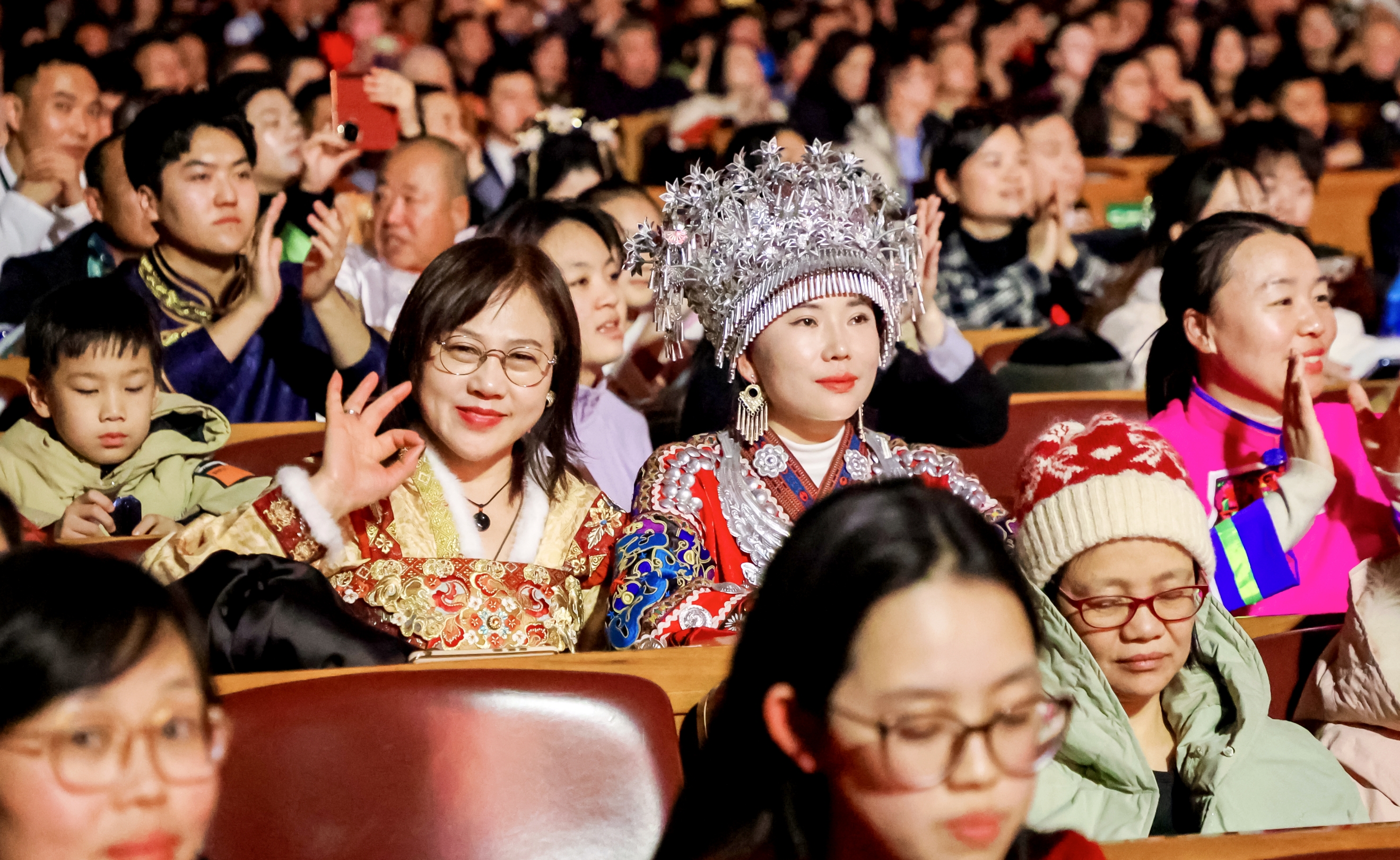 “听到了很多耳熟能详的作品,特别亲切。”观众齐先生带着父母来听音乐会,古稀之年的老两口亲睹关牧村、蒋大为的舞台风采,赞不绝口。同样激动的还有来自广西的观众韦雯彦:“能在小年夜走进人民大会堂观看演出,我觉得特别荣幸。”为赴这场盛会,韦雯彦和朋友们特地换上了壮族的节日盛装。今年,北京新春音乐会邀请500位多民族非遗传承人来到现场,各色民族服饰鲜艳如云霞,留下民族相亲、团结奋进的动人写照。