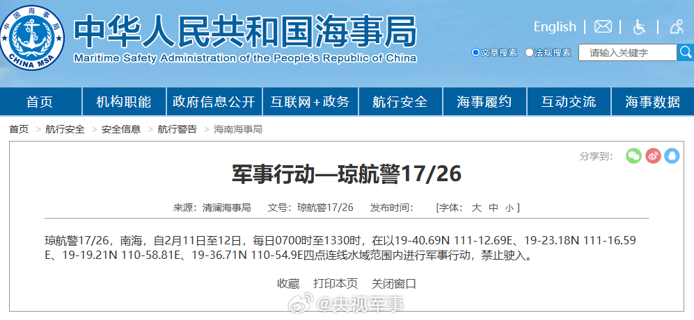 航行警告!2月11日至12日,南海部分海域进行军事行动
