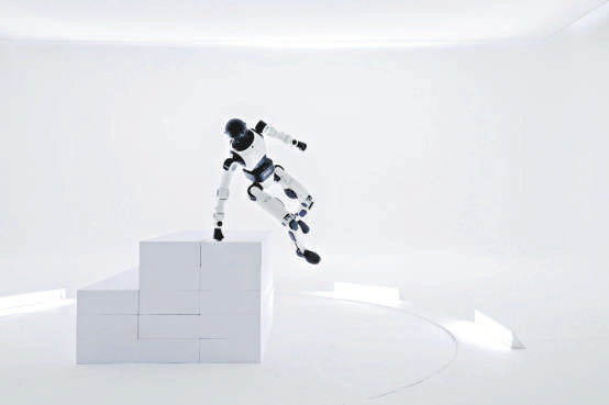 演示现场,一台身高约1.69米、体重62千克的黑白配色机器人单手支撑翻越约1米高的障碍,动作流畅稳定。不仅如此,全身具备43个自由度的它还能完成翻跟头、颠乒乓球、跳舞等一系列动作。