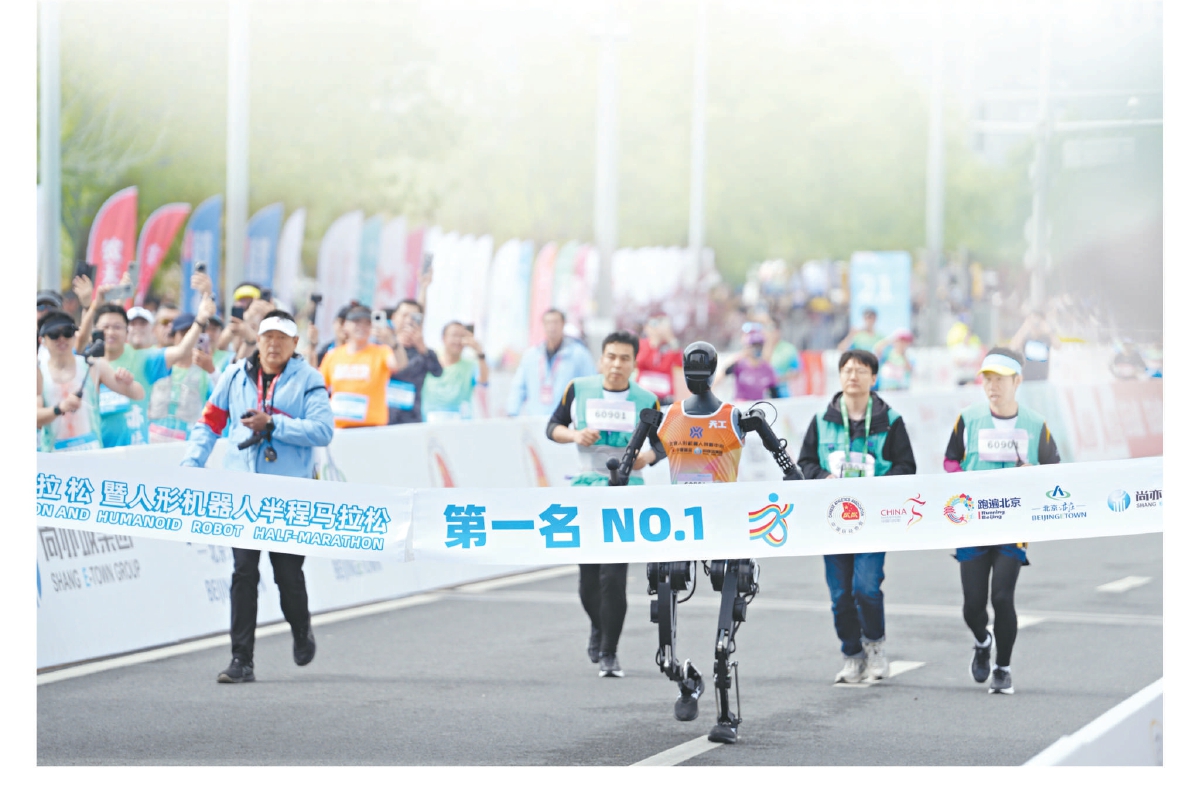 2025年4月19日10时11分,人形机器人“天工”冲过全球首个人形机器人半程马拉松的终点线,是第一个跑完全程的赛队。 北京日报记者 和冠欣摄