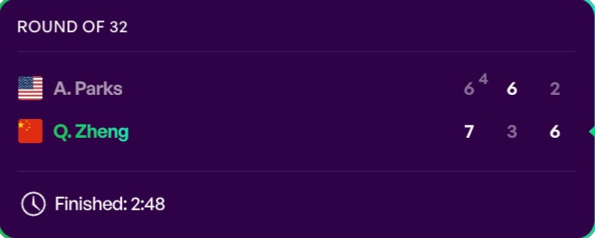 郑钦文与帕克斯此前两次交锋,双方各取一胜,这是她们首次在硬地相遇。比赛首盘,郑钦文通过“抢七局”以7比6(4)先赢一盘。帕克斯随后6比3扳回一城。决胜盘,郑钦文强势开局,接连破发,6比2拿下,取得复出以来的两连胜。