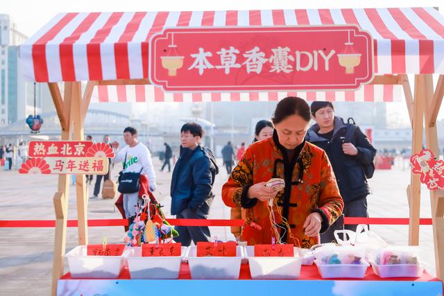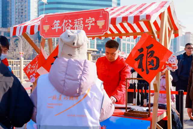 互动体验区年味拉满,四大新春年俗摊位同步开放:糖人制作甜香四溢、中药香囊DIY香气随身、中国结编织寓意吉祥,书法志愿者现场挥毫,春联福字免费写、免费送,墨香与年味儿相融,把传统年味带回家。