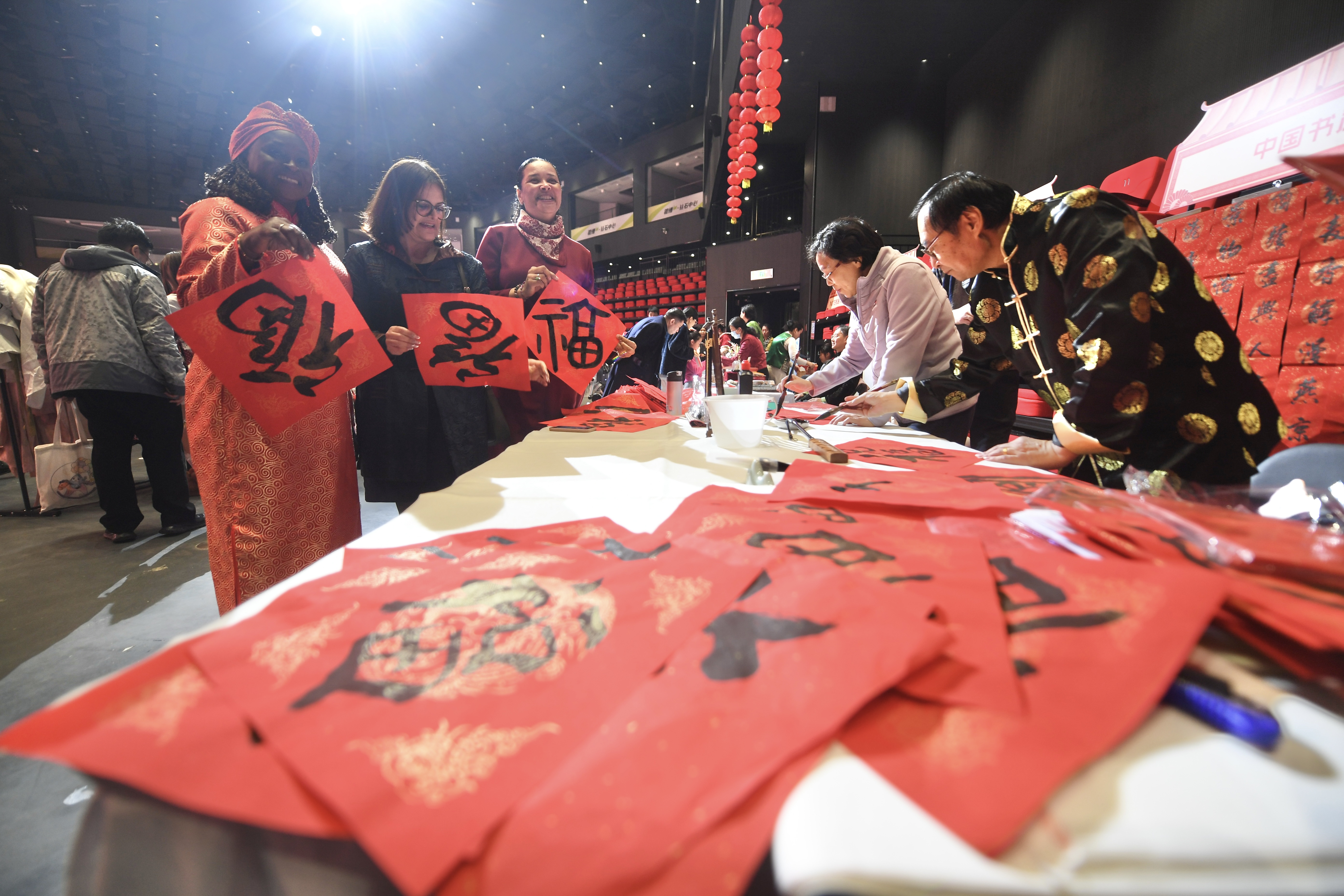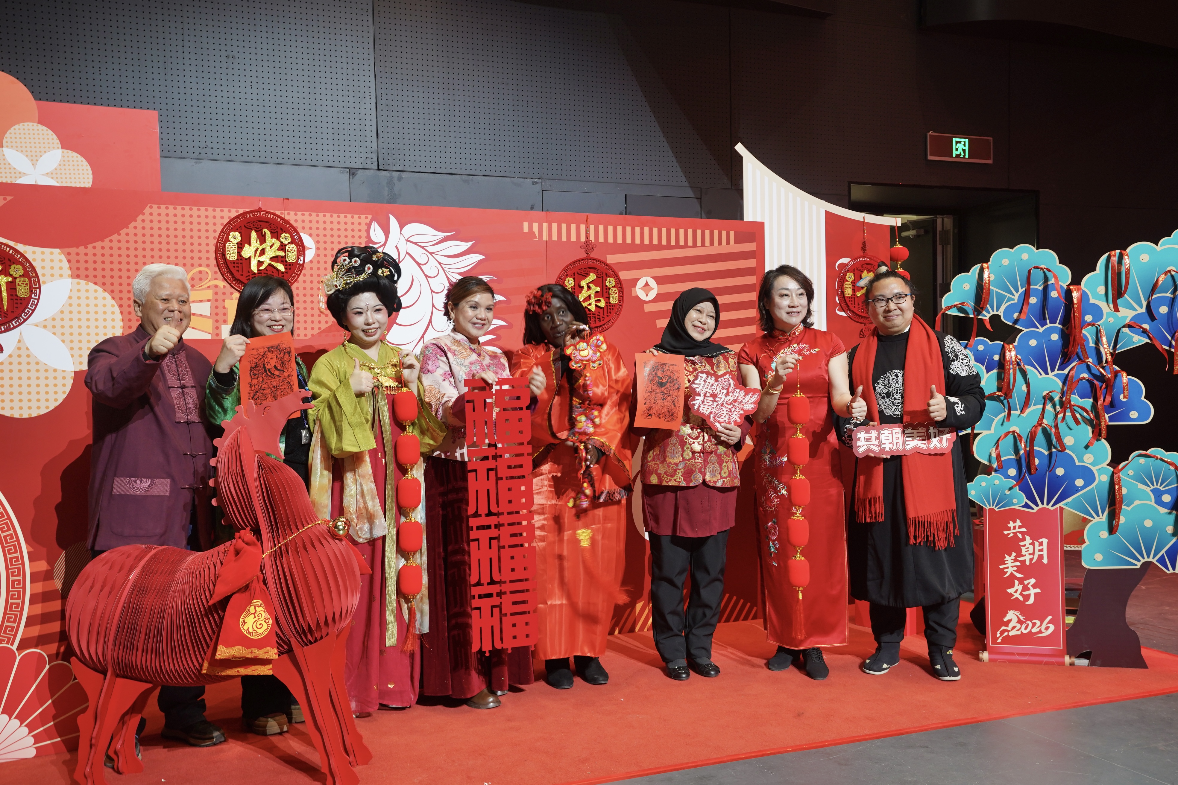 互动体验区设置了汉服打卡、AI徽章制作、“骐骥闯关”游戏、亲子手工坊、剪纸、写福字等活动,身着汉服与二次元服饰的礼仪人员全程提供双语服务。