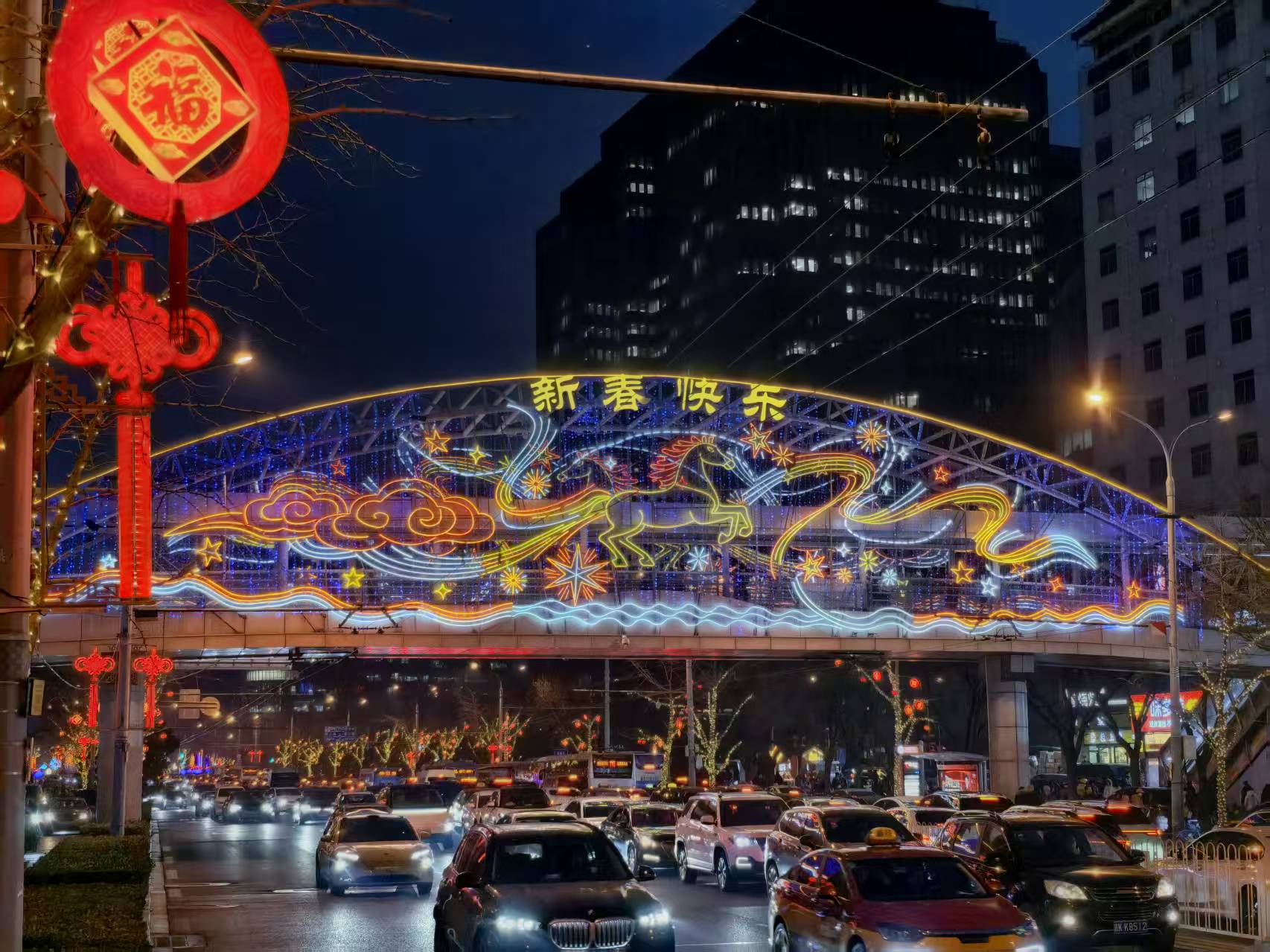 朝阳区春节景观布置结合“凤舞朝阳启新岁,龙马同春耀京华”主题,深度融合文化传承、国际视野与科技赋能,使用夜景照明、景观小品、树木亮化、桥体装饰、灯杆灯饰5种布置形式,融合生肖马、春联福字、年画窗花等传统元素和朝阳特质,全区共对60条主要大街悬挂灯笼、中国结灯饰3800余组,在重点区域布置8处景观小品、7条夜景靓丽街、14座过街天桥,动员街乡布置约164条居民小区、街巷胡同周边道路,悬挂灯饰9000余组。