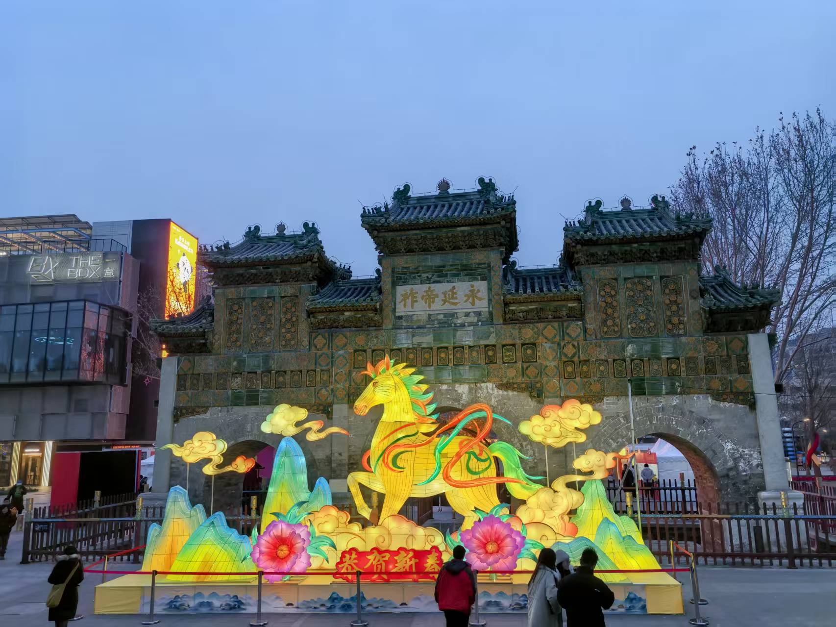 在朝外大街,主题为“骏彩迎新”的景观小品,以非遗自贡花灯展现骏马造型,融合千年灯艺与马年生肖文化。整个小品选取《千里江山图》的青绿元素,以青山搭配惟妙惟肖的骏马、国色天香的牡丹、祥云,青黄主调与东岳庙琉璃瓦交相辉映,彰显出非遗新春年味儿。