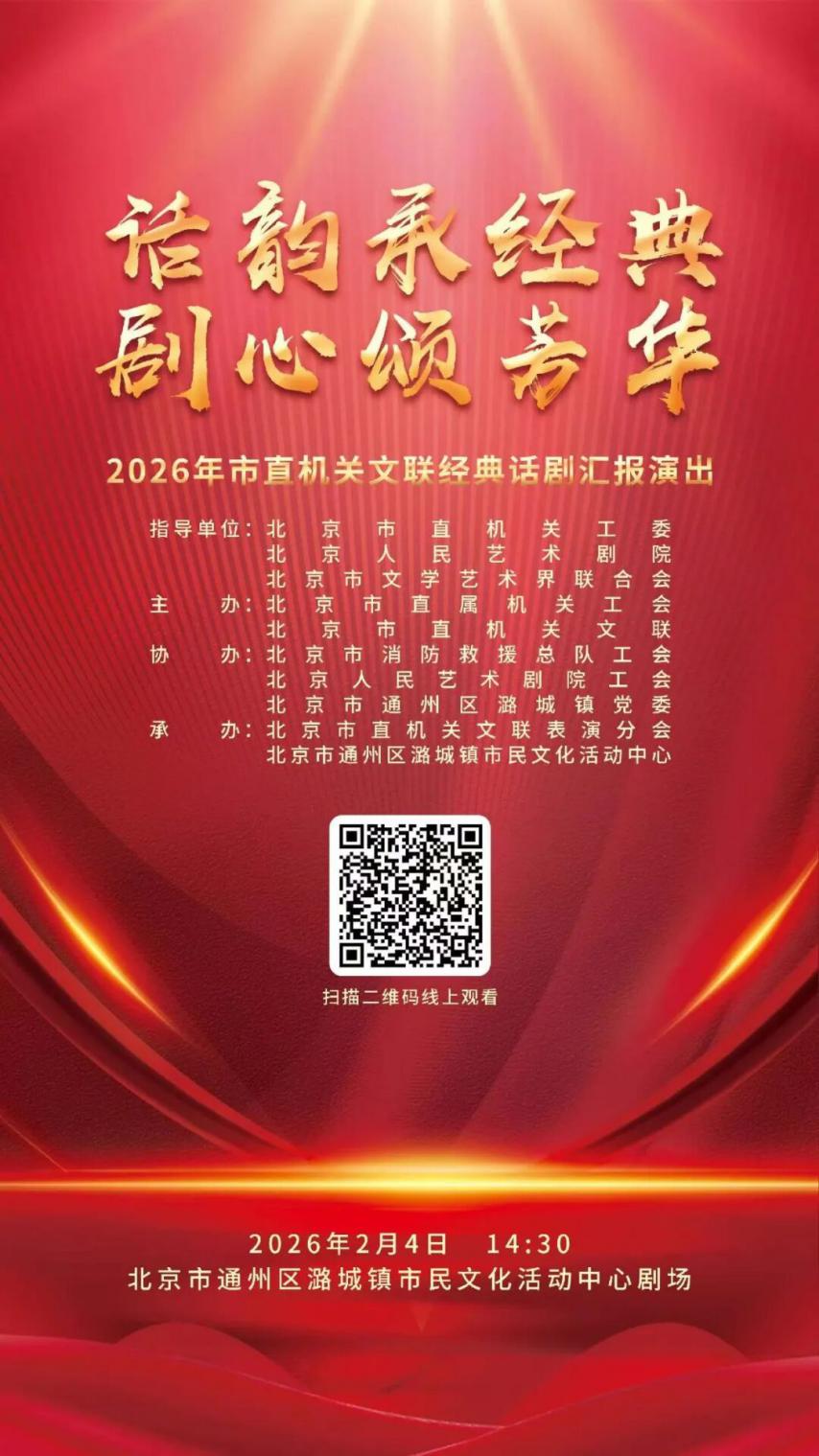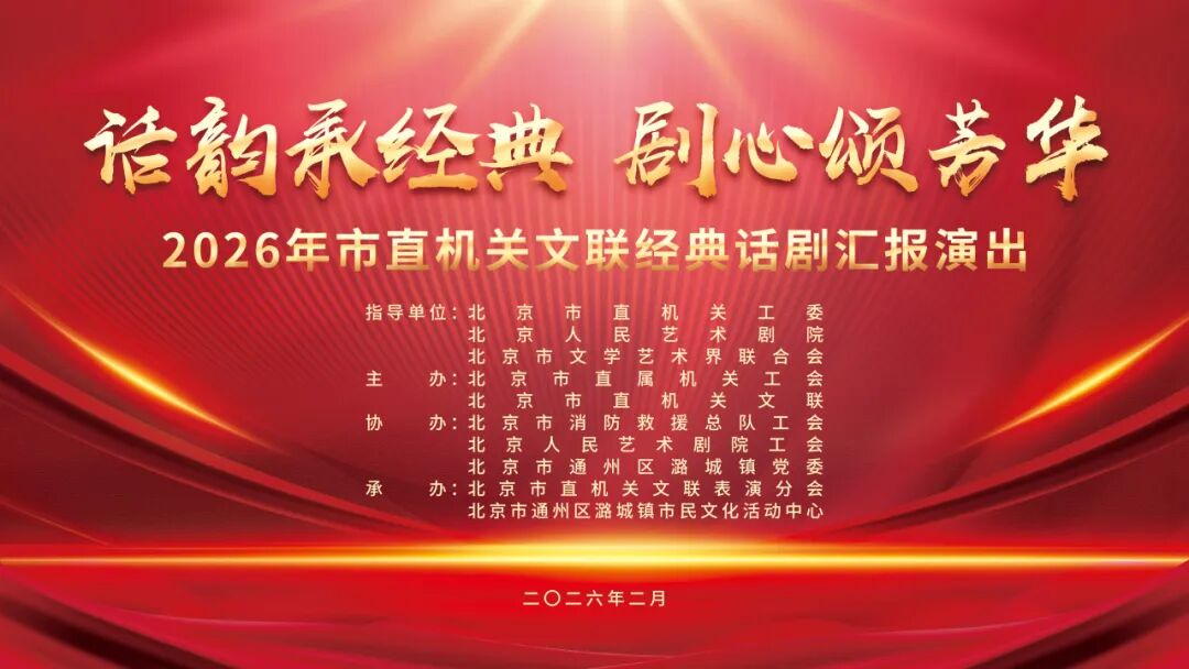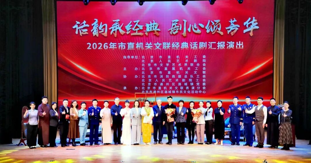 方寸舞台,演绎时代风云;咫尺光影,照见气象万千。2月4日下午,“话韵承经典 剧心颂芳华”2026年北京市直机关文联经典话剧汇报演出在通州区潞城镇市民文化活动中心举行。本场活动指导单位为北京市直机关工委、北京人民艺术剧院、北京市文学艺术界联合会,由北京市直属机关工会、北京市直机关文联主办,北京市消防救援总队工会、北京人民艺术剧院工会、北京市通州区潞城镇党委协办,北京市直机关文联表演分会、北京市通州区潞城镇市民文化活动中心承办,旨在以话剧艺术为载体,厚植市直机关文化底蕴,丰富干部职工精神文化生活,为市直机关文化建设提质增效注入蓬勃生机。市直机关工委副书记、一级巡视员、市直机关文联名誉会长何群,市总工会一级巡视员赵丽君,市文联党组成员、副主席韩云升,市消防救援总队党委委员、政治部主任、机关党委书记、工会主席冯向阳,市直机关工会主席、市直机关文联会长谷民参加活动,线下300余名来自市直机关各单位的文艺骨干及干部职工代表与线上千余名干部职工共赴一场对话经典的艺术之约。