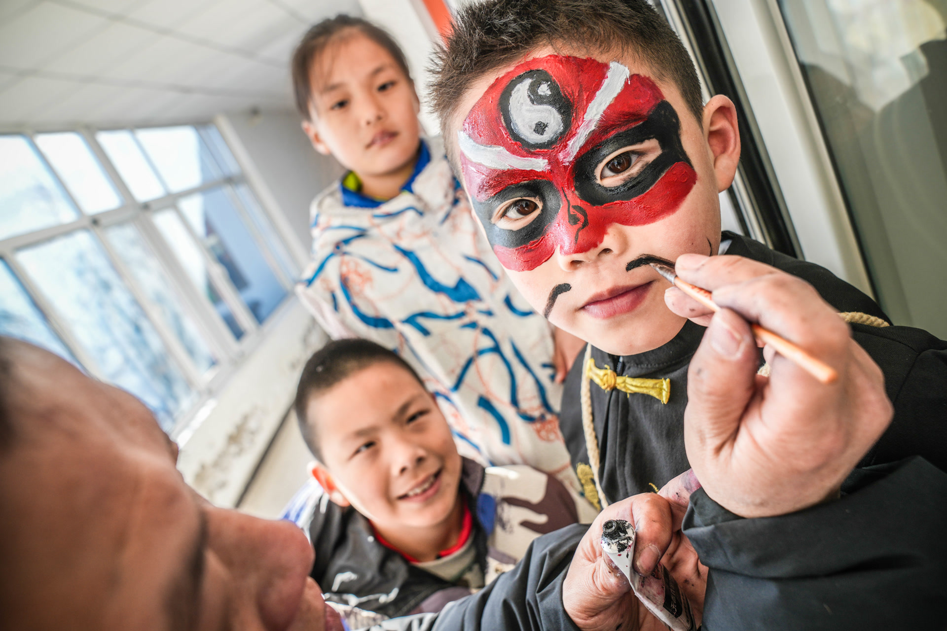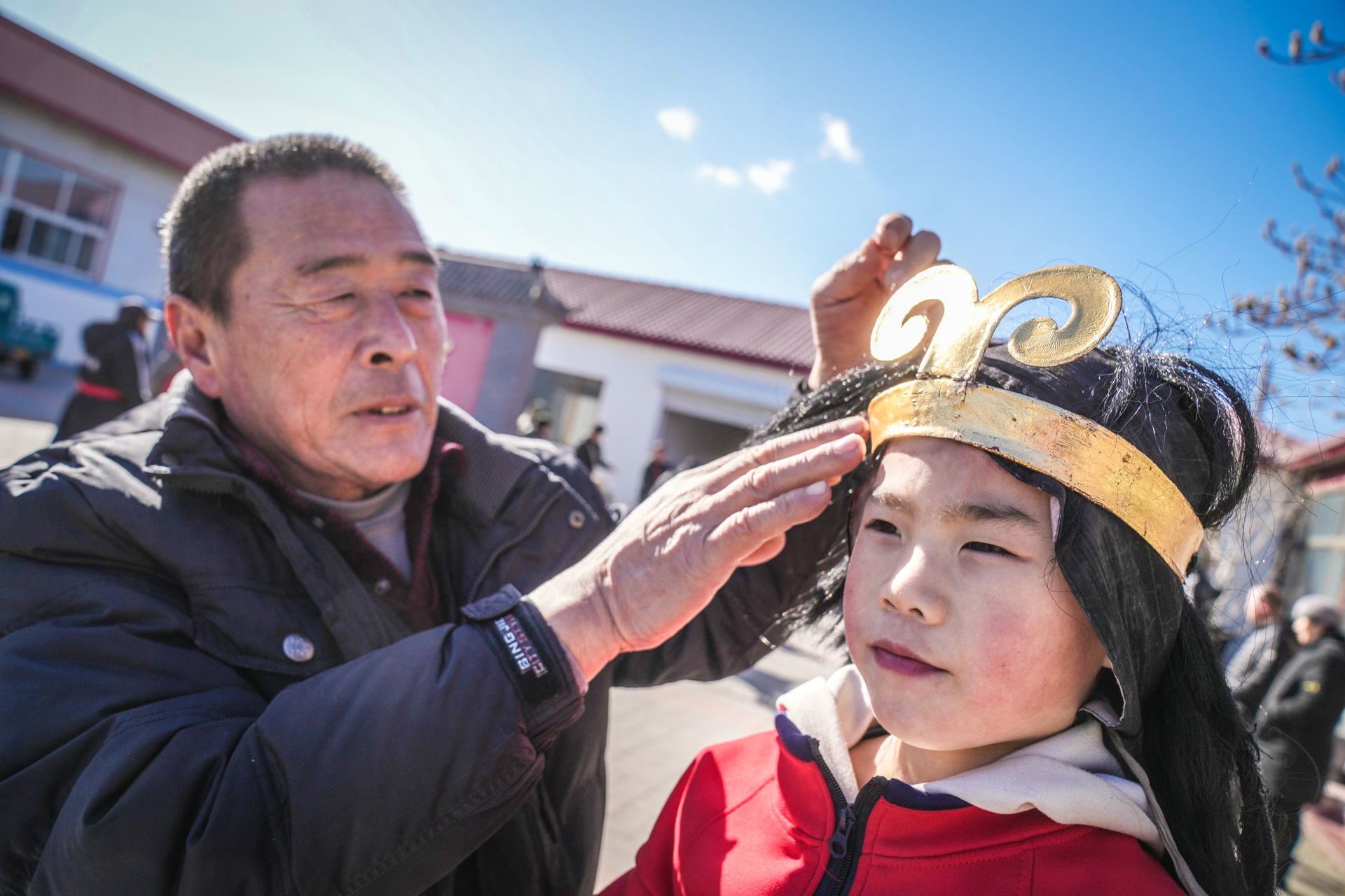 周末清晨,7岁的兰思诺跟着63岁的爷爷兰绍坡,早早来到村委会前的空地。爷爷自幼练习高跷,这天特意将自己的金头箍戴在小孙子额头上。“咱们演的是‘大头行’,就是《水浒传》里鲁智深带领众好汉三打祝家庄!”兰思诺刚上一年级,还不太懂水浒故事,却被爷爷绘声绘色的讲述深深吸引。穿上专属戏服、画上花脸,小家伙瞬间精气神十足。