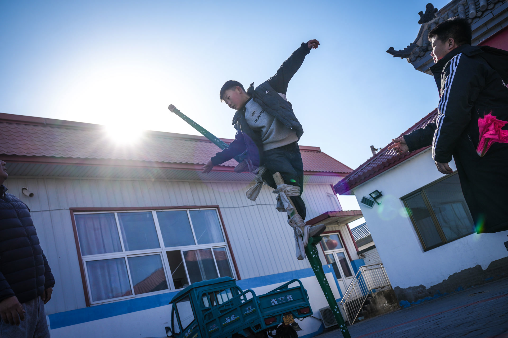 19岁的兰佳欣在外地上大学,每年假期都会准时回村。看着场上奔跑嬉闹的弟弟妹妹,他满是乡愁与温情:“和发小、乡亲们一起玩高跷,就是记忆里家的感觉。”话音刚落,他便与伙伴擂起鼓点,欢快的节奏在村庄上空回荡。