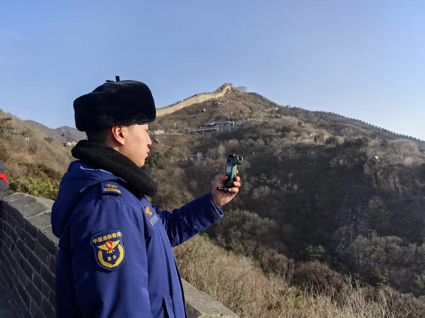在长城上前行,不到半小时,寒风便能穿透棉服,脸颊被刮得发麻,而指战员们却步履不停,时而驻足察看长城周边植被干枯程度,时而俯身排查城墙角落是否有烟头、火星。