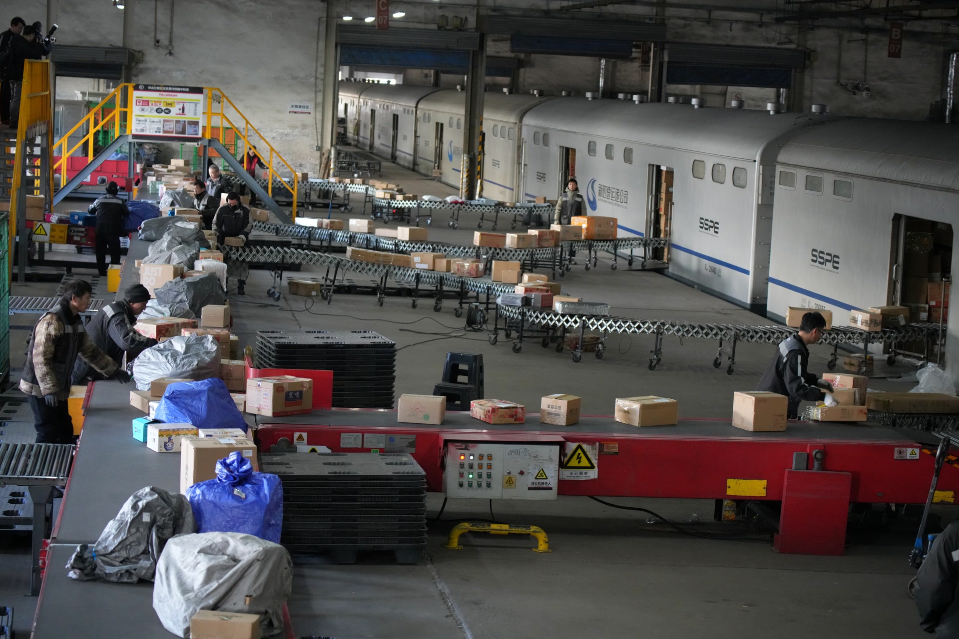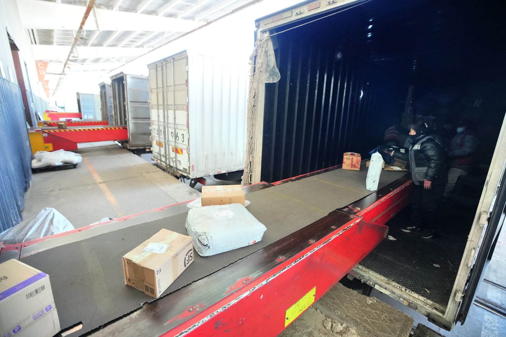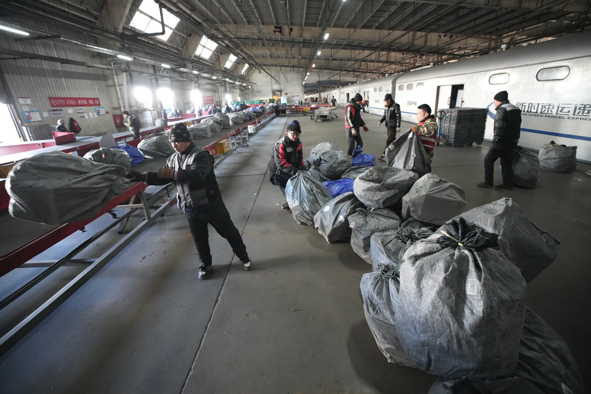 车还没进库,就能透过车窗看到特快货物班列内被一批批年货塞得满满当当。9时30分,货场两侧站台上,铁路货场、顺丰、京东等单位的100余名工作人员齐上阵,将这些快递箱、快递袋从火车上搬下,放至传送带“排队”,再由专人分拣、分装到目的方向不同的车上,送至千家万户。