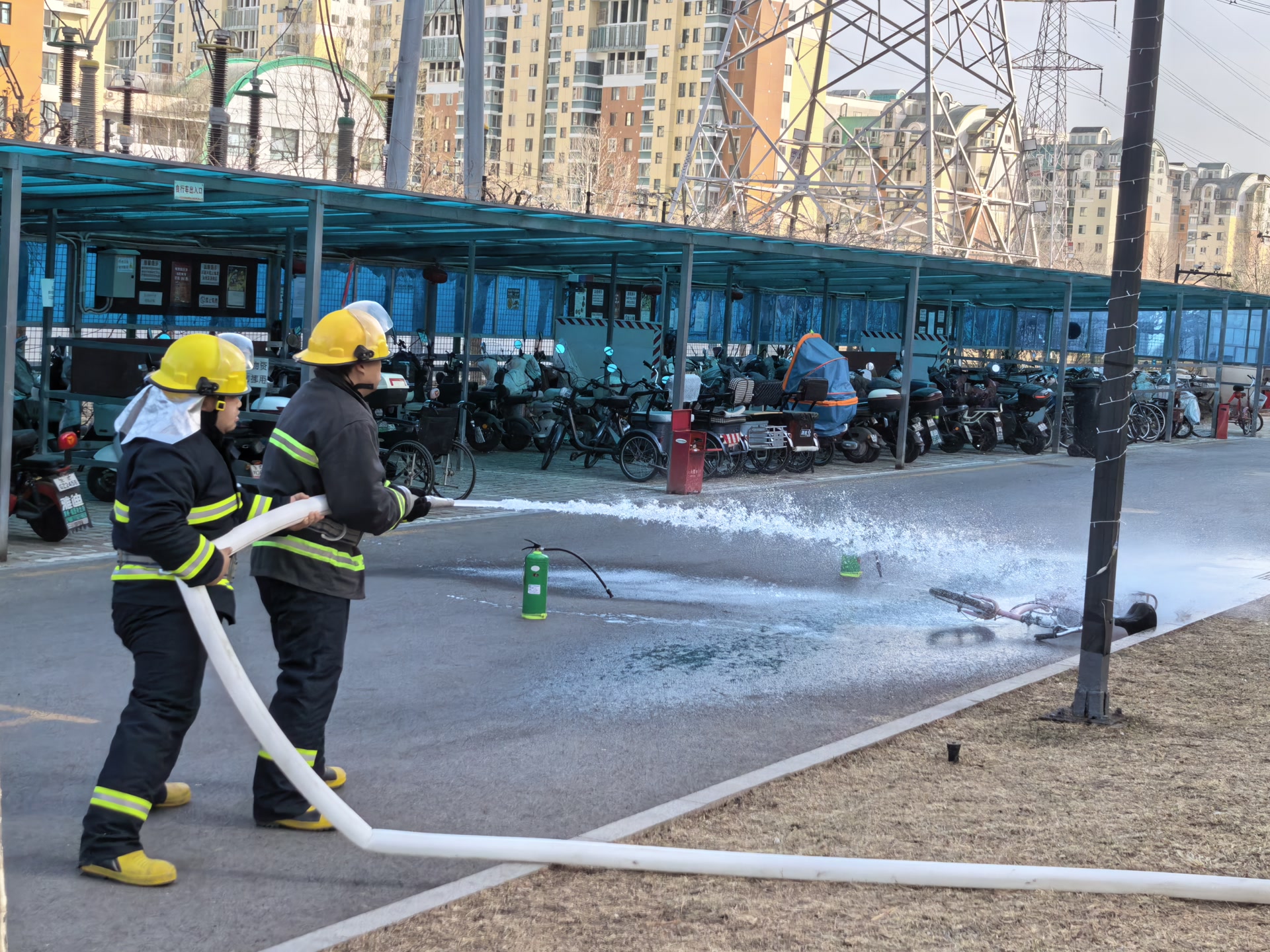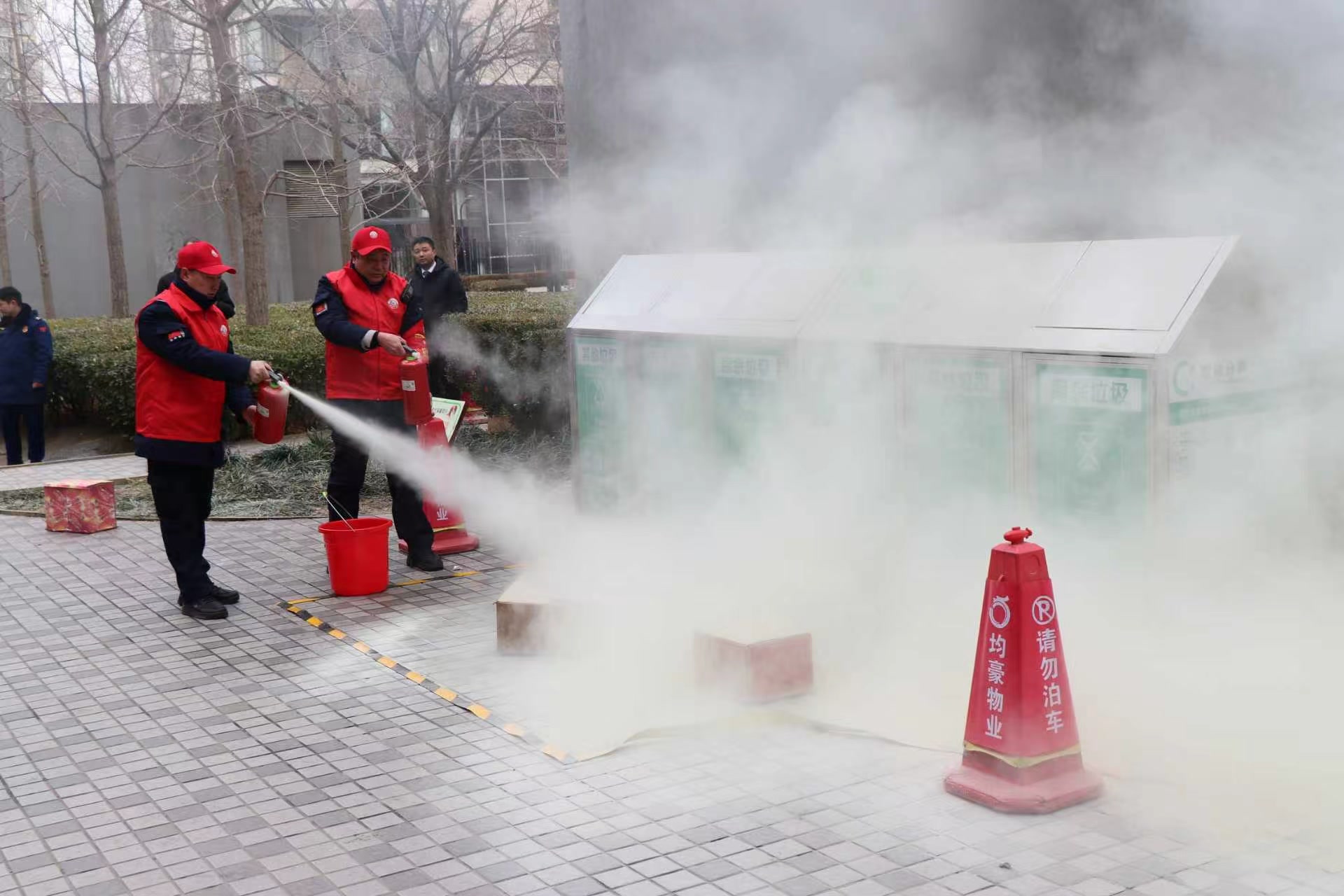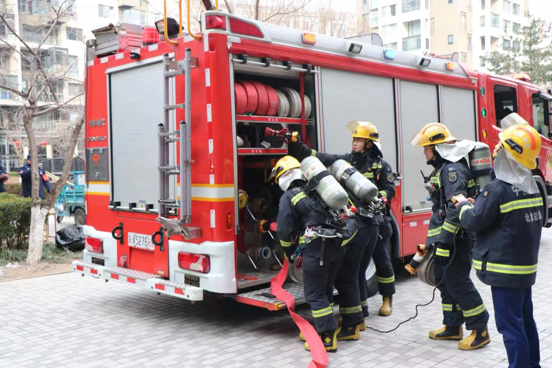 2月9日下午,朝阳区宝星华庭小区广场,一场高层住宅消防演练模拟了违规燃放烟花爆竹引燃杂物的情景。演练中,物业巡逻员发现“火情”后立即上报,应急指挥部随即成立,物业人员、社区网格员和业主志愿者组成的应急小组迅速行动,完成了从初期扑救、疏散人员到配合专业消防力量救援的全流程作业。