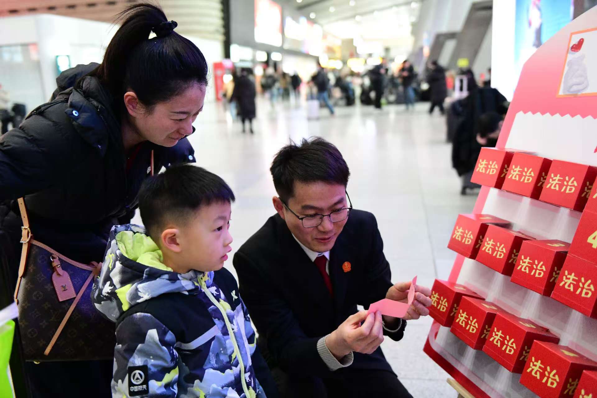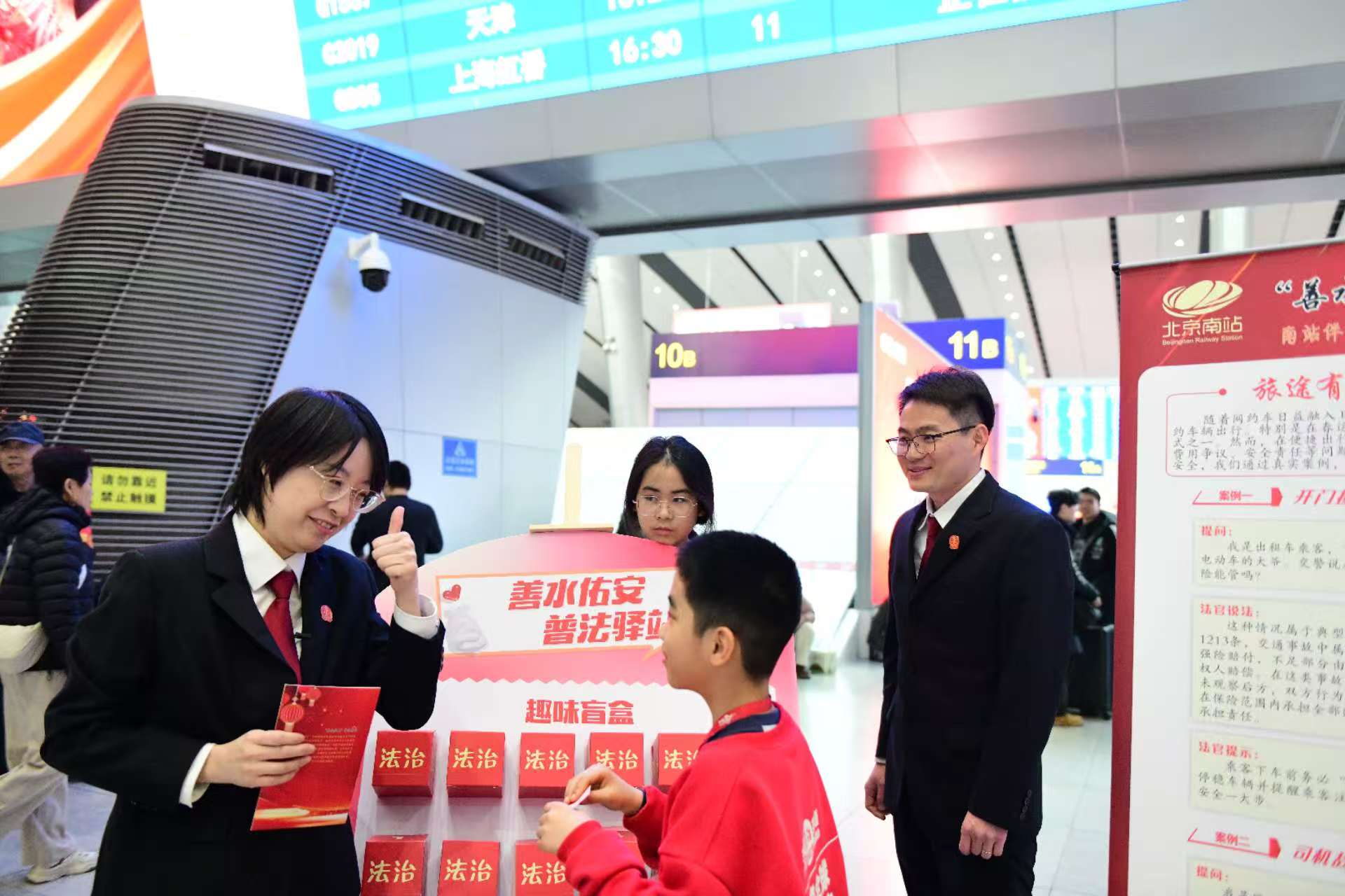 春运期间,北京南站候车大厅里,一场别开生面的“法治盲盒”互动吸引了不少旅客驻足参与。丰台区人民法院依托“善水佑安”普法驿站,联合国铁北京局北京南站、市重点站区管委会南站地区管理办公室、北京铁路公安处北京南站派出所、丰台区右安门街道办事处共同开展此次主题普法宣传活动,将法律知识装进盲盒,送到旅客身边。
