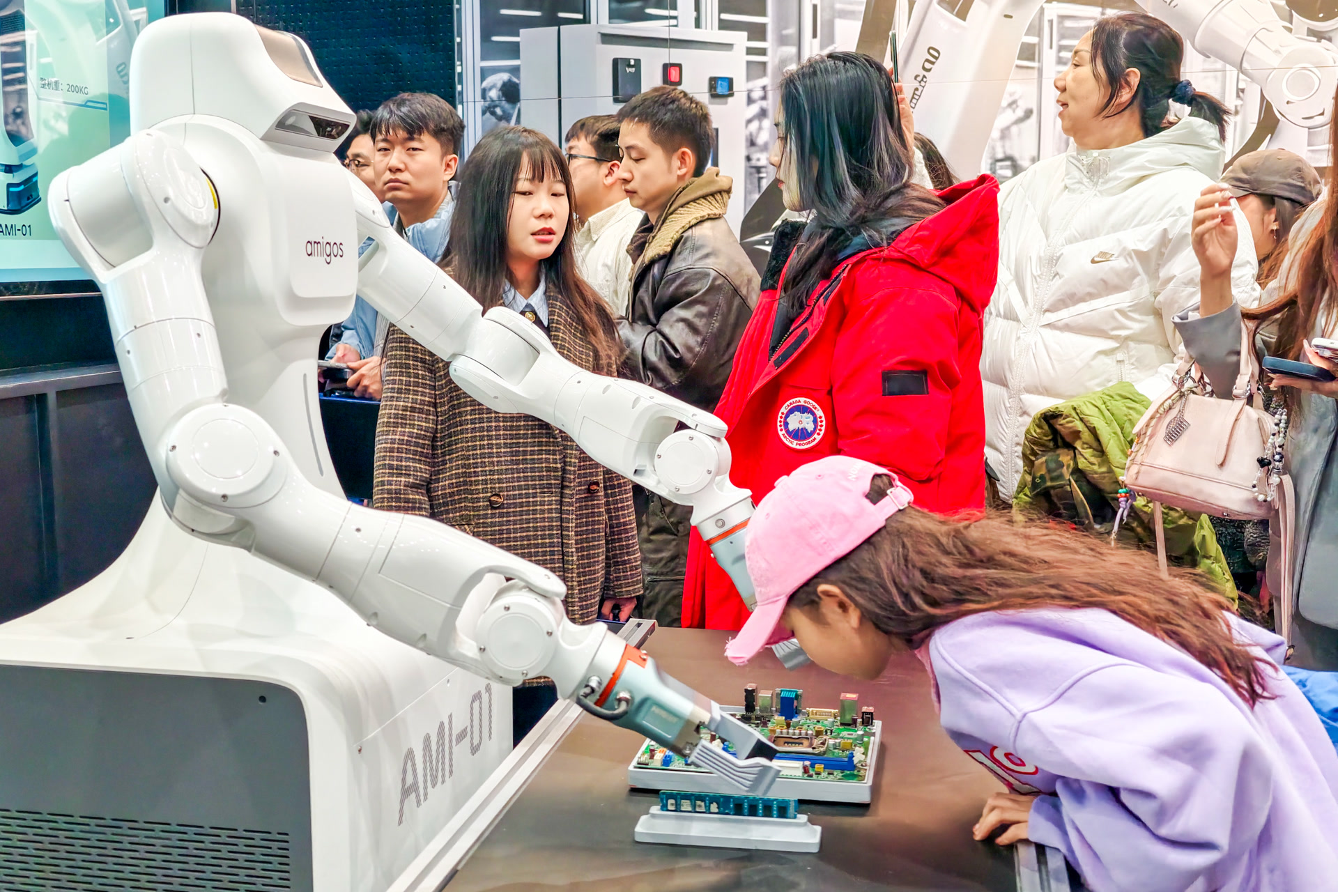 在机器人训练区,机器人灵活的手臂在传送履带上完成货品分拣作业,医疗区的手术机器人能帮助医生精准医疗。照料区的智能轮椅机器人最引人注目,参观者可以坐上首款消费级AI运动外骨骼机器人,就能在模拟楼梯和坡道上流畅行走。“机器人走起来很轻快,感觉很舒适,如履平地!”一位观众体验后说。