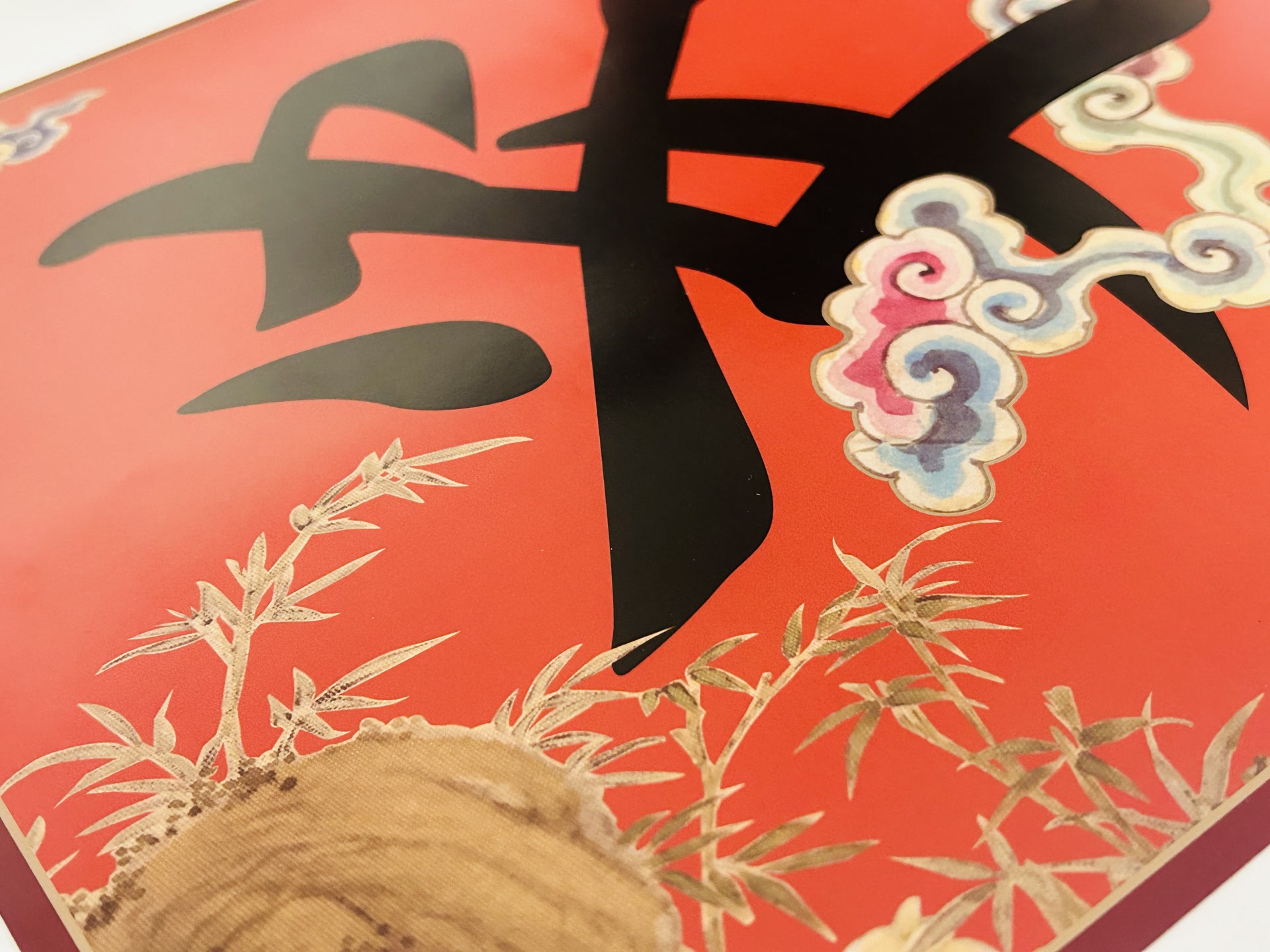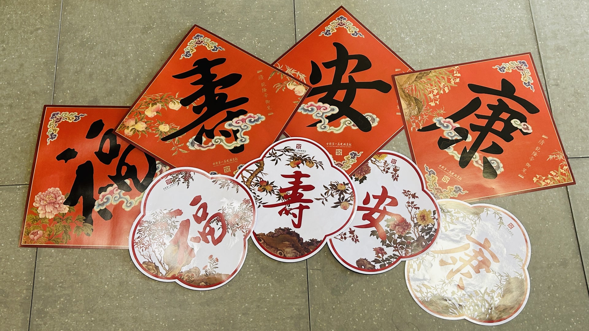 四幅红彤彤的“福寿安康”斗方鲜艳喜庆,配合四幅古朴雅致的窗贴,相得益彰。“斗方用墨笔字,窗贴用朱笔字,题字均从乾隆皇帝朱批中选取。背景所配的祥云、寿桃、牡丹、灵芝、竹子等吉祥图案,取自馆藏的清代画师徐扬绘制的《万寿图并诗》。”一史馆展览教育处工作人员介绍,此画作为徐扬在乾隆帝南巡时所献,内含多幅有吉祥寓意的自然风物图并配有诗文。“设计时,我们从中专门选取了与字意相协的图案,如用竹子图案衬托‘安’字,取‘竹报平安’之意,将字画的吉祥寓意融为一体。”