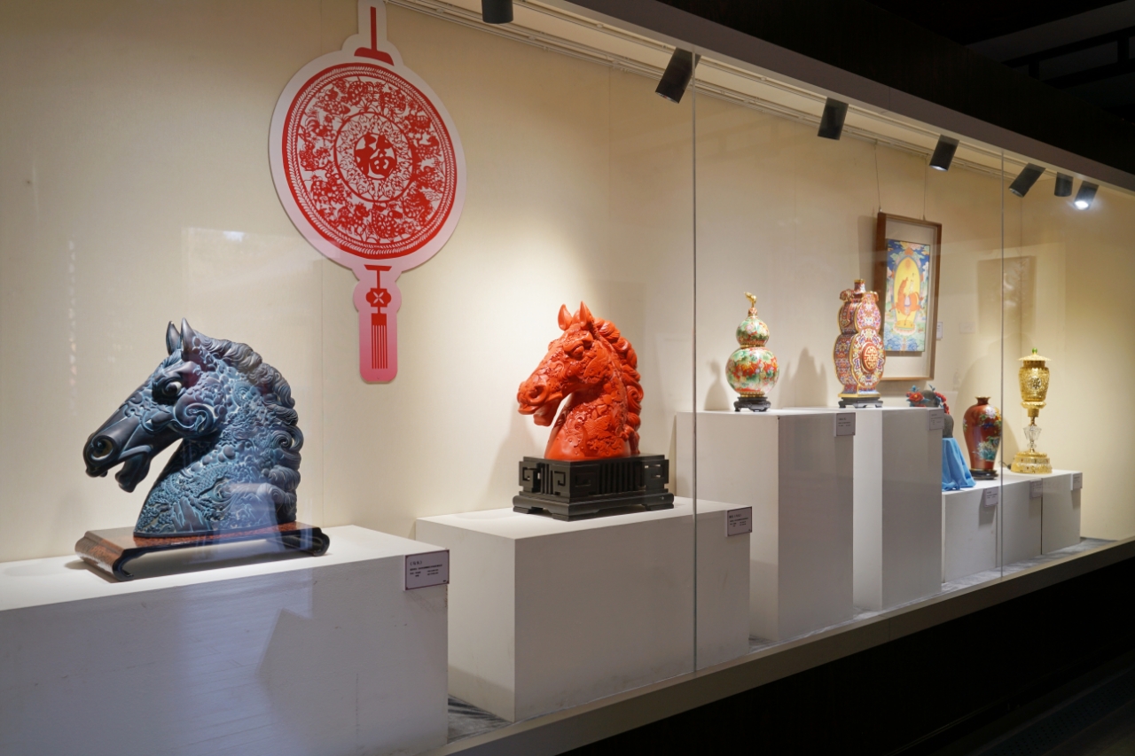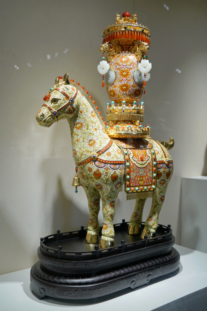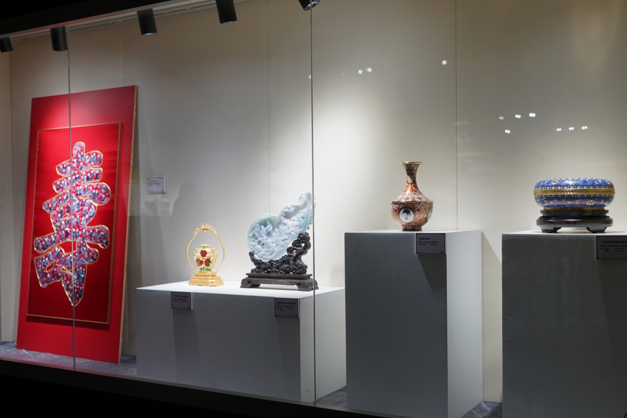步入展厅,游客可欣赏到花丝镶嵌与珐琅的交织璀璨、京绣传递的吉祥寓意,以及雕漆的层叠朱红、翡翠的温润光泽。每件作品既凝聚着传统手艺的坚守,也承载着吉祥的文化寓意。