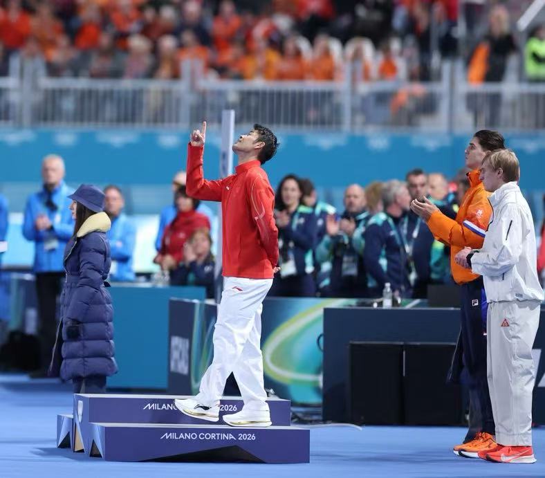 站上米兰冬奥会领奖台的那一刻,宁忠岩做出了经典向上指的手势。“从我练滑冰那天起,梦想就是在奥运会上让国旗升起。这一刻,十多年的努力,没有白费。”