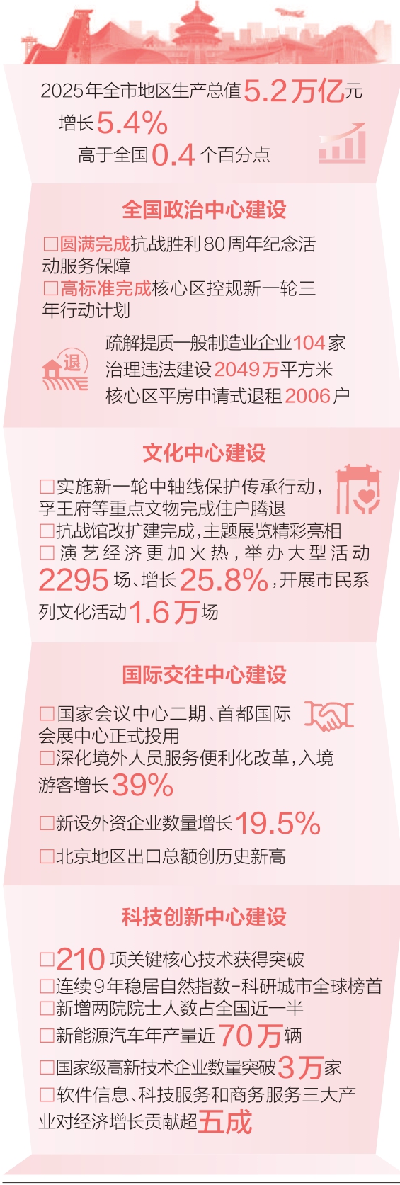 由“聚”到“疏”实现历史性转变。从疏解破题,坚持向外疏解转移和内部功能重组双向发力,进而成为全国首个实施减量发展的超大城市,北京于“逆向路径”中走出上扬曲线,“5万亿之城”含金量十足。习近平总书记在中央城市工作会议上指出,北京在推动减量发展、克服大城市病方面,这些年是在蹚一条路子。