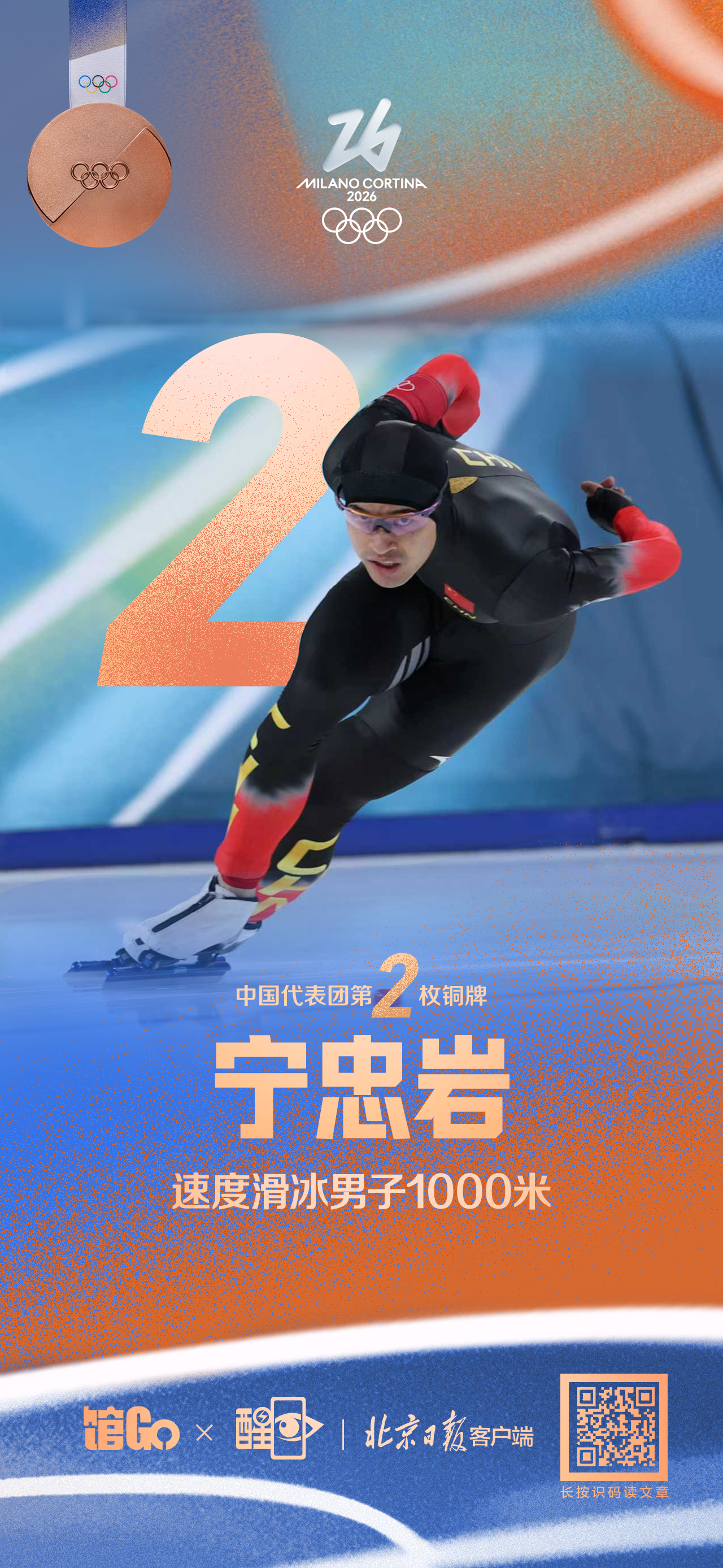 北京时间2月12日凌晨,中国代表团开幕式旗手宁忠岩以1分07秒34的成绩冲线,收获米兰-科尔蒂纳速度滑冰男子1000米铜牌。四年前北京冬奥会,他与铜牌仅差0.12秒;四年后,他终于将那枚“差一点”的奖牌挂在胸前,同时刷新中国体育代表团冬奥会该项目的最好成绩。