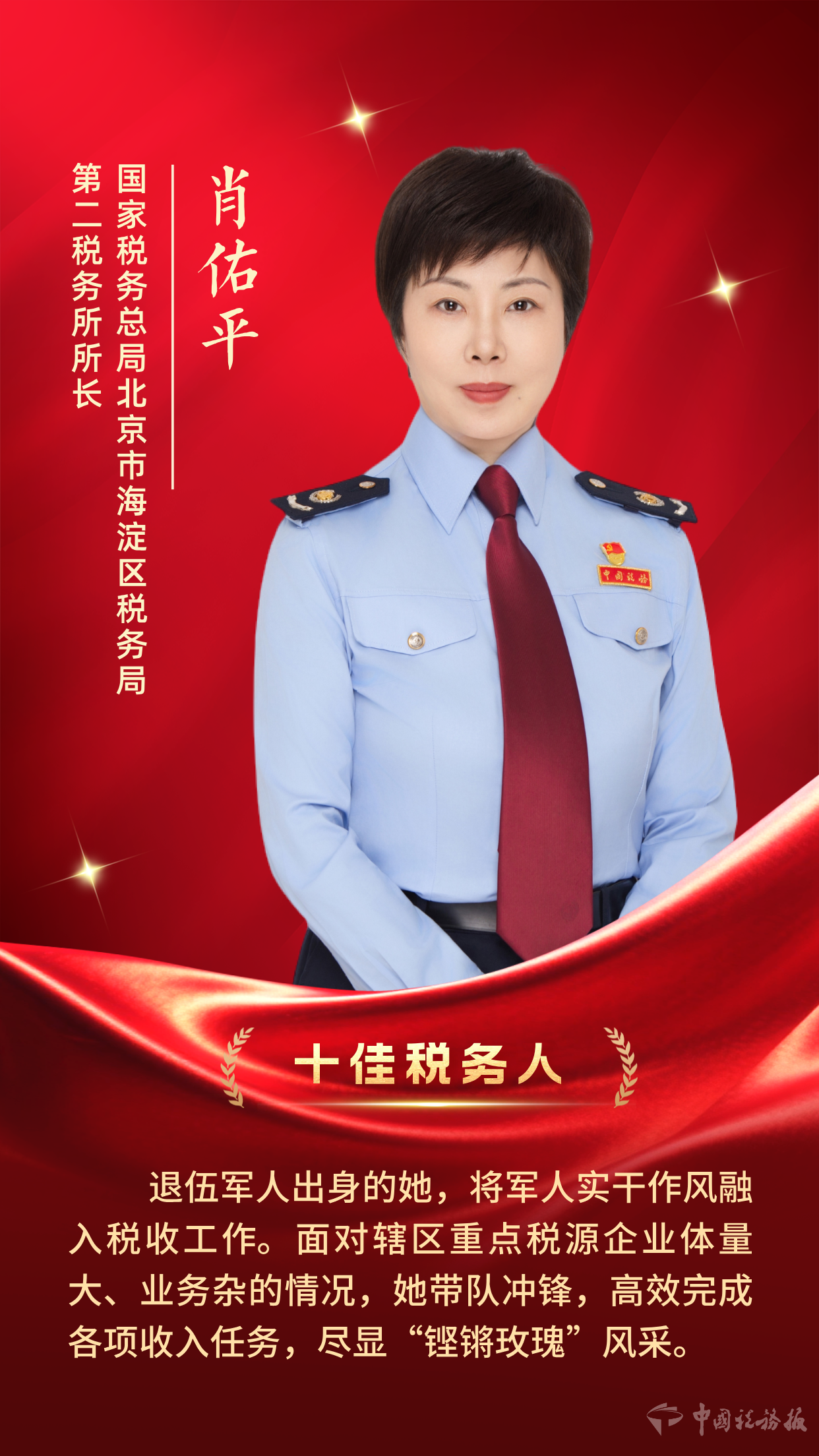 从守土为国的军人,到守护国家经济血脉的税务尖兵;从专攻技术的通信工程师,到运筹帷幄的大企业税收管理专家,肖佑平始终以忠诚与坚韧,以专业与情怀,扎根税收一线,认真践行“为国聚财、为民收税”的使命,交出了一份无愧于时代、无愧于人民、无愧于职责的优异答卷。