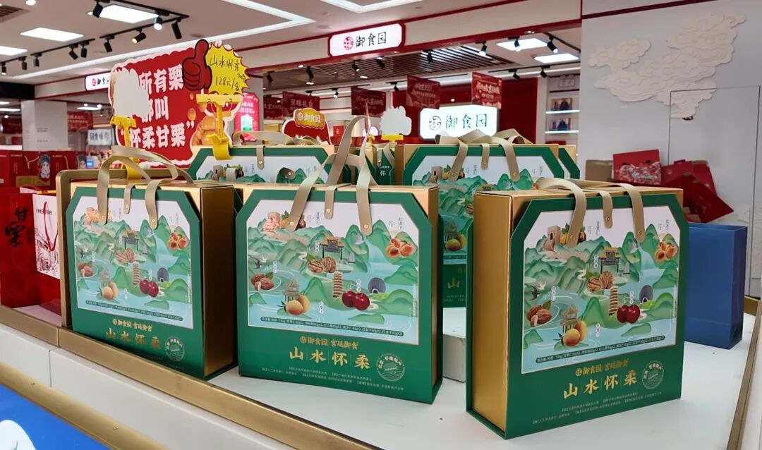 兼具地域文化与多元风味的御食园“山水怀柔”礼盒同样备受青睐。礼盒整合板栗、杏仁、核桃等六类特色产品,原料均选自怀柔本地优质产区,保留了最纯正的怀柔味道。此外,包装也精心设计,融入雁栖湖、慕田峪长城等地标景观,让伴手礼不仅是味觉的享受,也是传递怀柔山水人文之美的载体,成为市民选购伴手礼的人气之选。