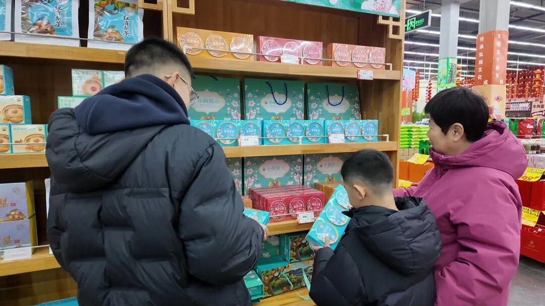 在星东天地生活购物广场,不少市民在“品味怀北”专柜前挑选年货礼盒。怀北镇红肖梨茶、板栗小碗梨等农产品深加工产品,因天然风味与食疗价值,成为新春送礼佳品。