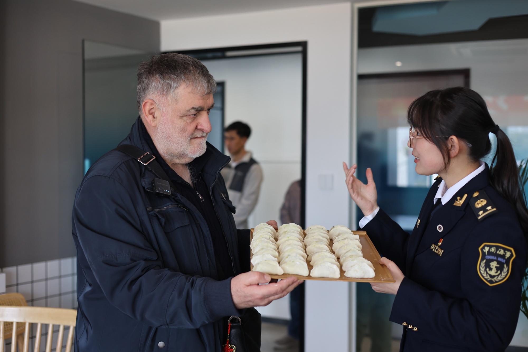 正午,团圆家宴如约开席。船员们亲手包制的饺子鲜香四溢,雪蛤蒸蛋、清蒸海鲈鱼、苔菜小白虾等本地特色菜肴风味浓郁,水果、点心精致诱人。中外船员围坐一桌,举杯互致新春祝福,即兴唱起故乡民谣。歌声在席间彼此交错、久久回响。