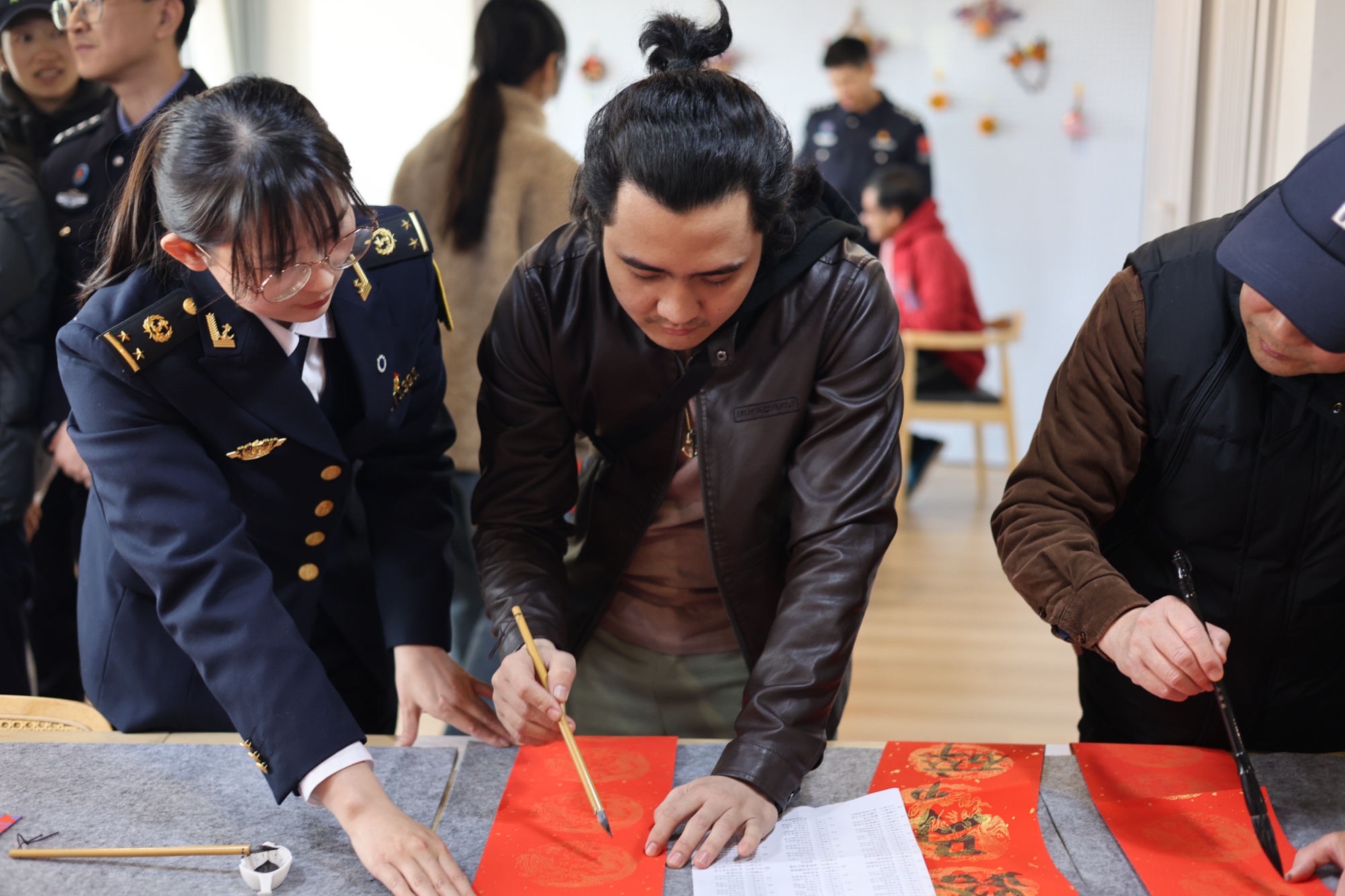 包饺子、写春联的沉浸式体验,更让文化共鸣直抵人心。饺子区面香氤氲,志愿者手把手教擀皮、填馅、捏褶……船员们包出姿态各异的饺子。书法区墨香四溢,船员们手握毛笔,一笔一划认真书写新春期许。菲律宾籍船员EYAS RICH ROVEN握笔的手微微颤抖,在志愿者的轻声鼓励下,写出“福”字。举着亲手书写的春联,他满脸成就感:“我要把这副春联带回船上,贴在驾驶室!”